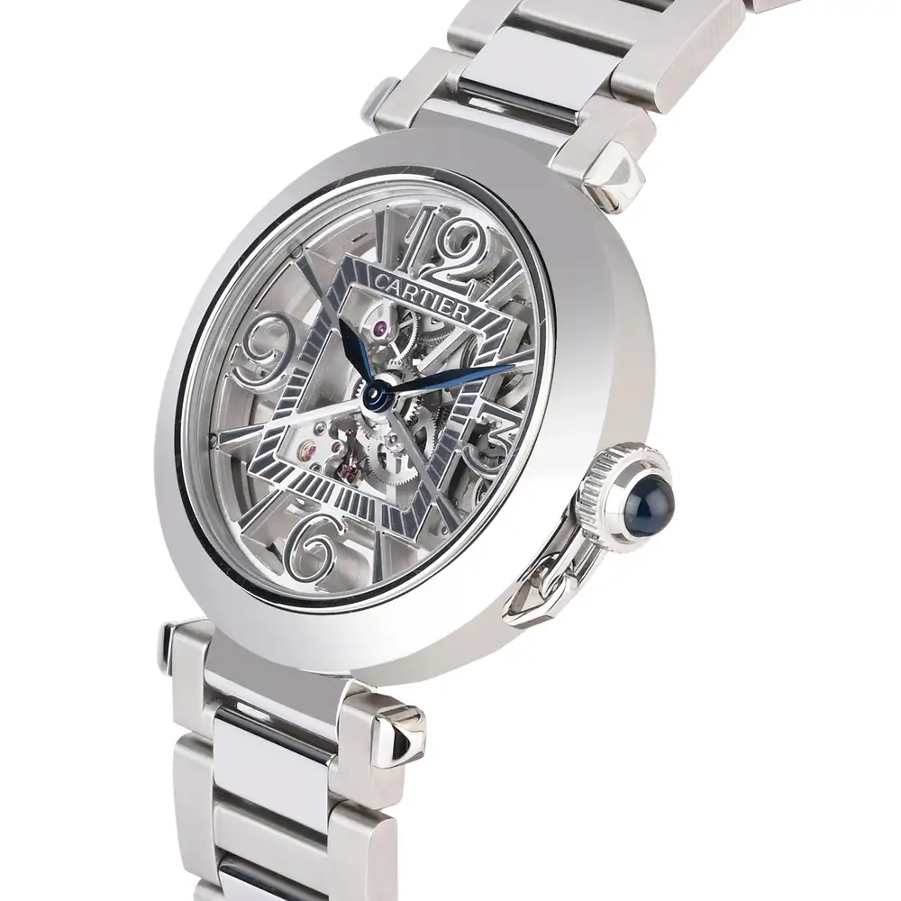 The Cartier Pasha WHPA0007 is a luxurious timepiece that features a striking skeletonized dial, revealing the intricate inner workings of its movement. Housed in an elegant case with a distinctive round shape, this watch combines classic sophistication with modern design elements. With its bold aesthetic and exceptional craftsmanship, the Pasha WHPA0007 embodies Cartier's commitment to luxury and innovation, making it a standout choice for discerning collectors.