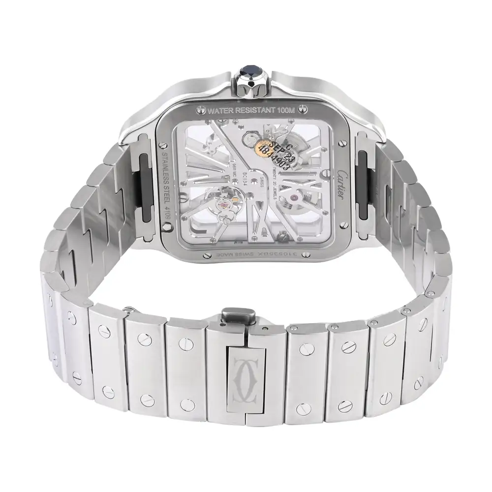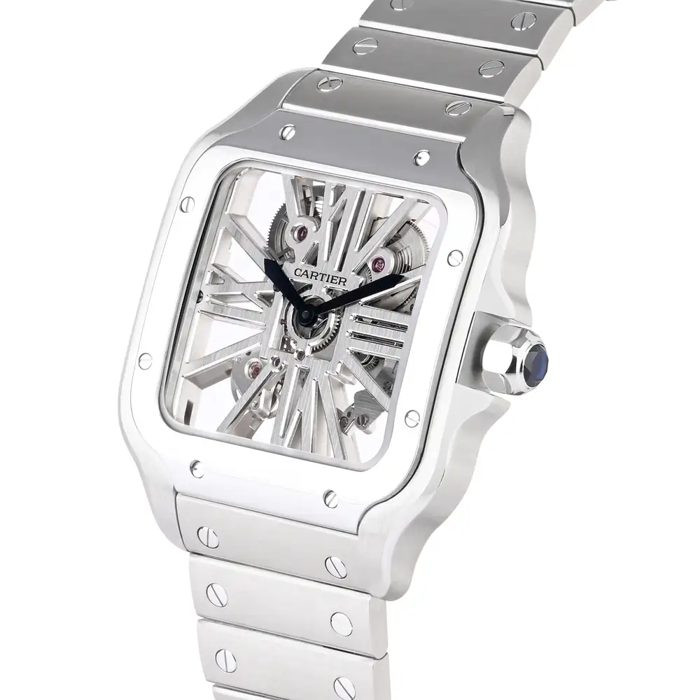 The Cartier Santos de Cartier Skeleton is a luxurious timepiece that elegantly combines contemporary design with classic sophistication. Crafted from stainless steel, its open-worked skeleton dial reveals the intricate mechanics of its manual-winding movement, set within an iconic 39.8mm square case. With exposed screws and integrated Roman numeral hour markers, this striking watch is a statement piece for those who appreciate the artistry of fine watchmaking and modern luxury