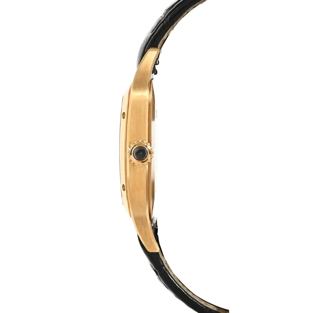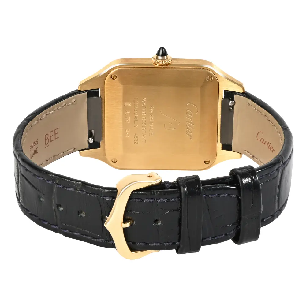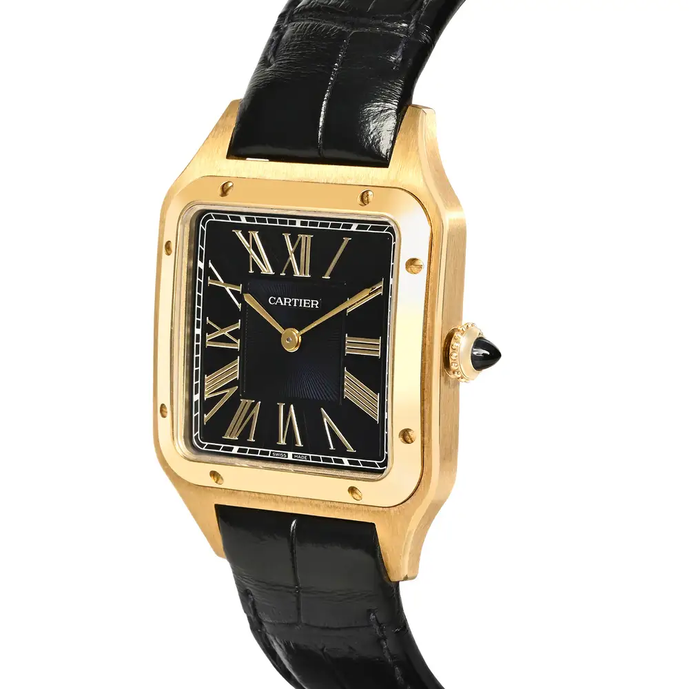 The Cartier Santos-Dumont WGSA0077 is a refined expression of Cartier’s aviation heritage. Crafted in 18K yellow gold, it features a black dial with elegant Roman numerals, blued-steel sword hands, and the iconic Santos screws on the bezel. Paired with a black alligator leather strap and powered by a reliable quartz movement, this model embodies timeless elegance and understated luxury.