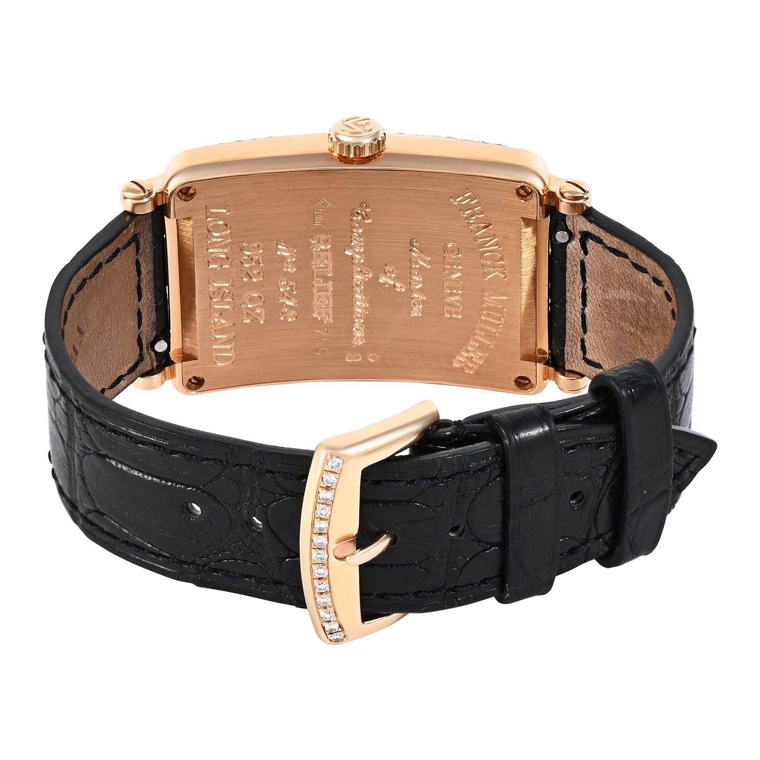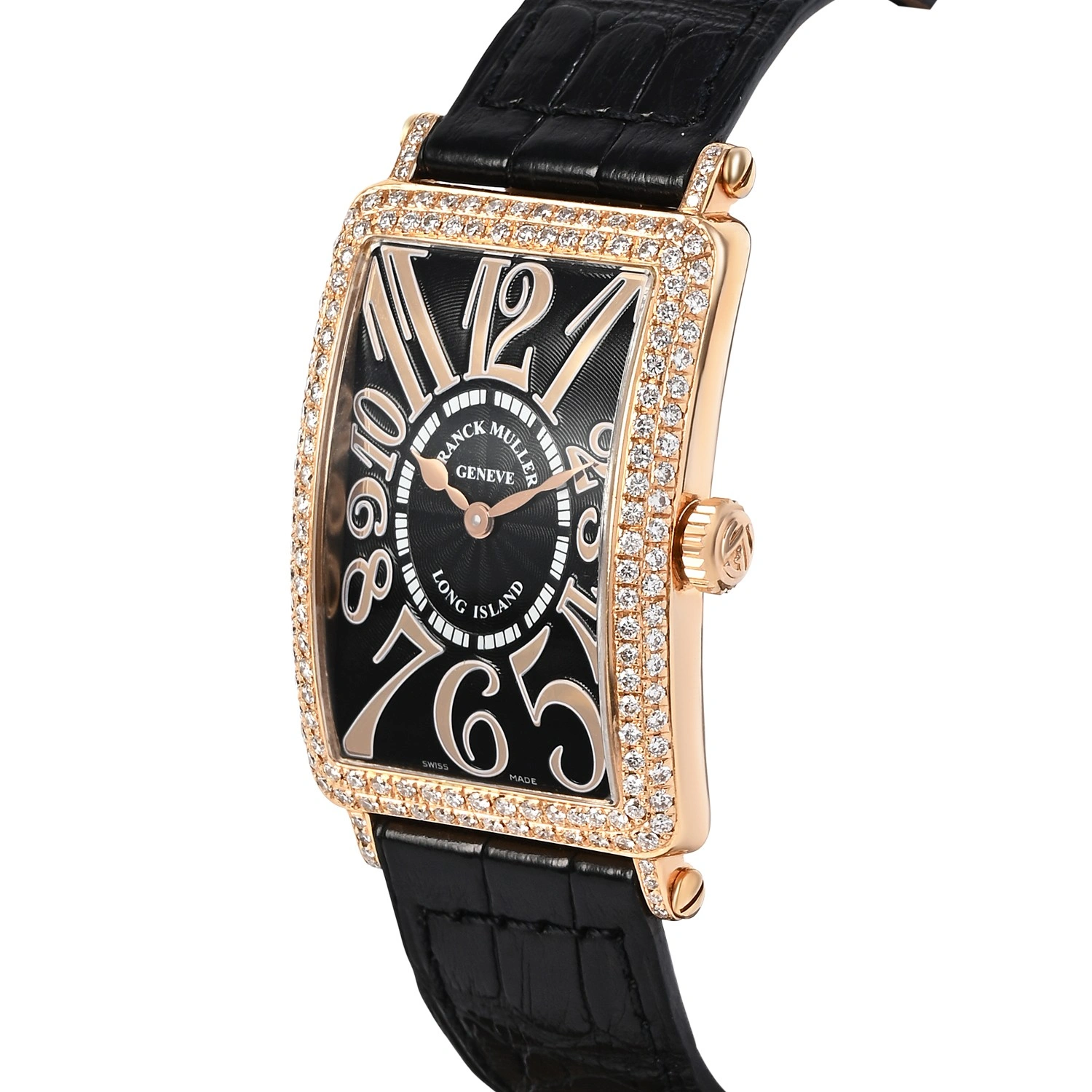 A true statement of elegance, this exquisite Franck Muller Long Island 952QZ features a polished 18k rose gold case adorned with a diamond-set bezel. Its iconic elongated rectangular design is accentuated by the classic sunray guilloché dial, with bold rose gold Arabic numerals and sleek rose gold hands. Powered by a precise quartz movement, this luxurious timepiece offers both sophistication and reliability. A perfect blend of artistry and craftsmanship, ideal for those with a taste for timeless luxury.
