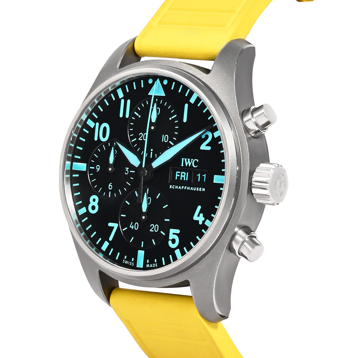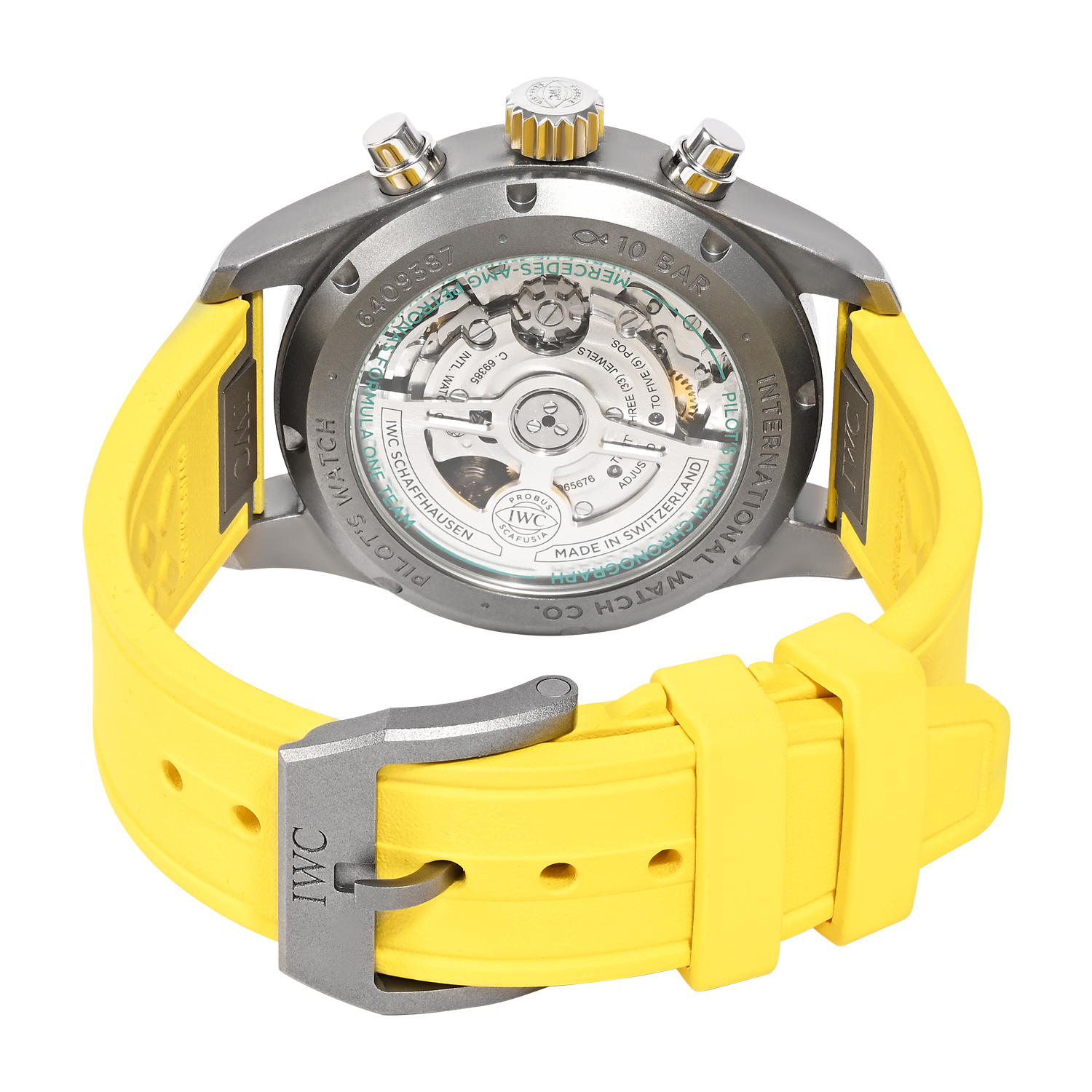 The IWC Pilot’s Watch Chronograph “Mercedes-AMG Petronas Formula One Team” IW388108 is a bold and performance-driven men’s timepiece inspired by the speed and precision of Formula 1. Featuring a striking black dial with Petronas green accents and highly legible Arabic numerals, it delivers a sporty cockpit-style look. The chronograph function adds practical timing capability, while the day-date display enhances everyday usability. Paired with a vibrant Petronas green rubber strap and supplied with two extra straps (calfskin and yellow rubber), this watch is perfect for collectors and motorsport enthusiasts who want a modern pilot chronograph with strong wrist presence.