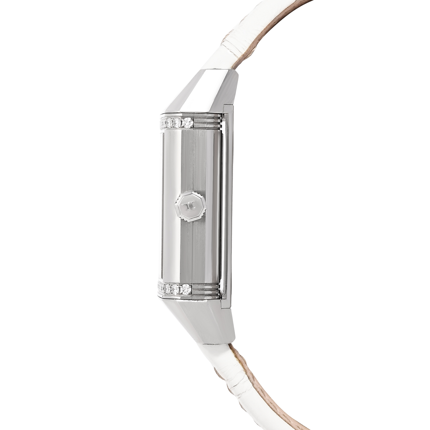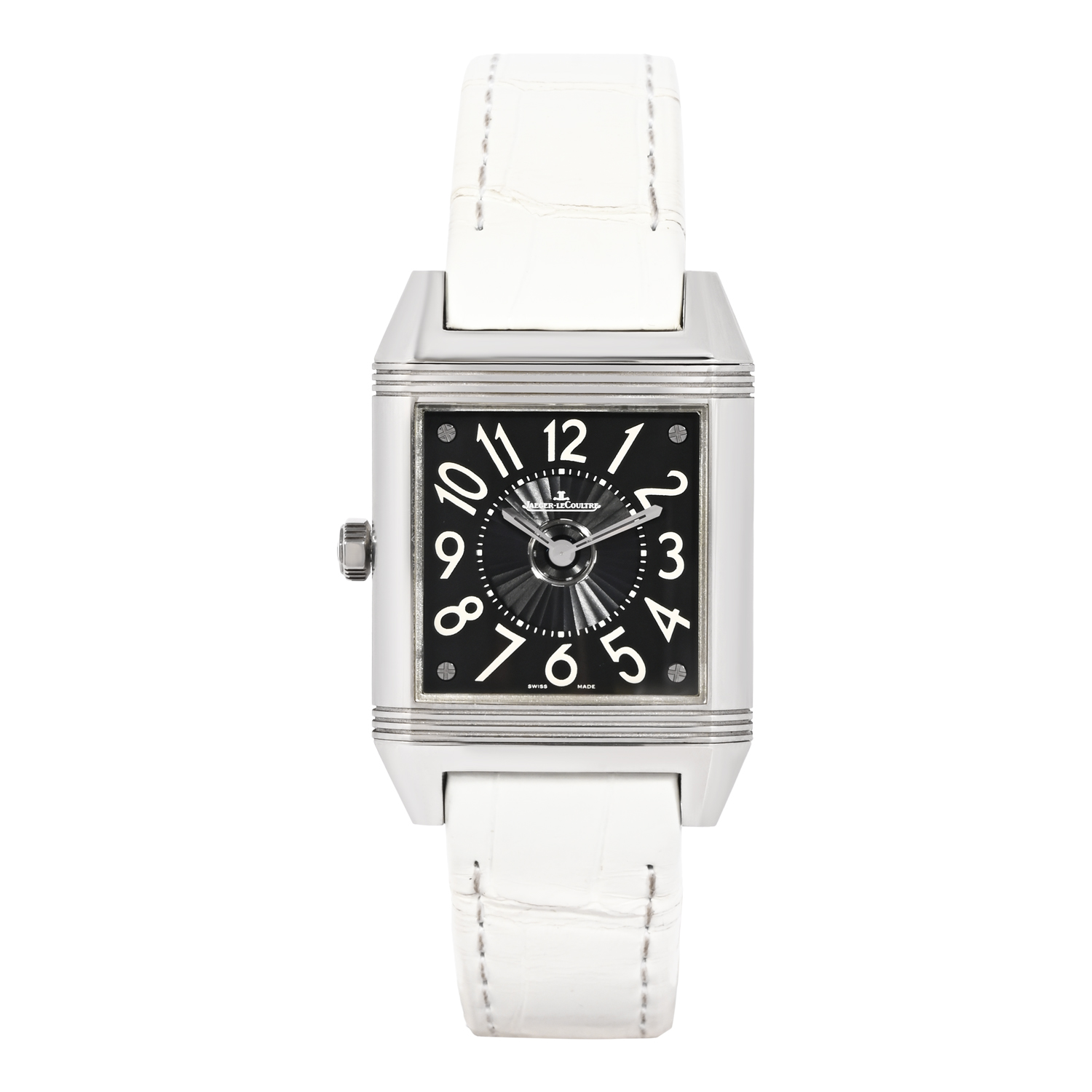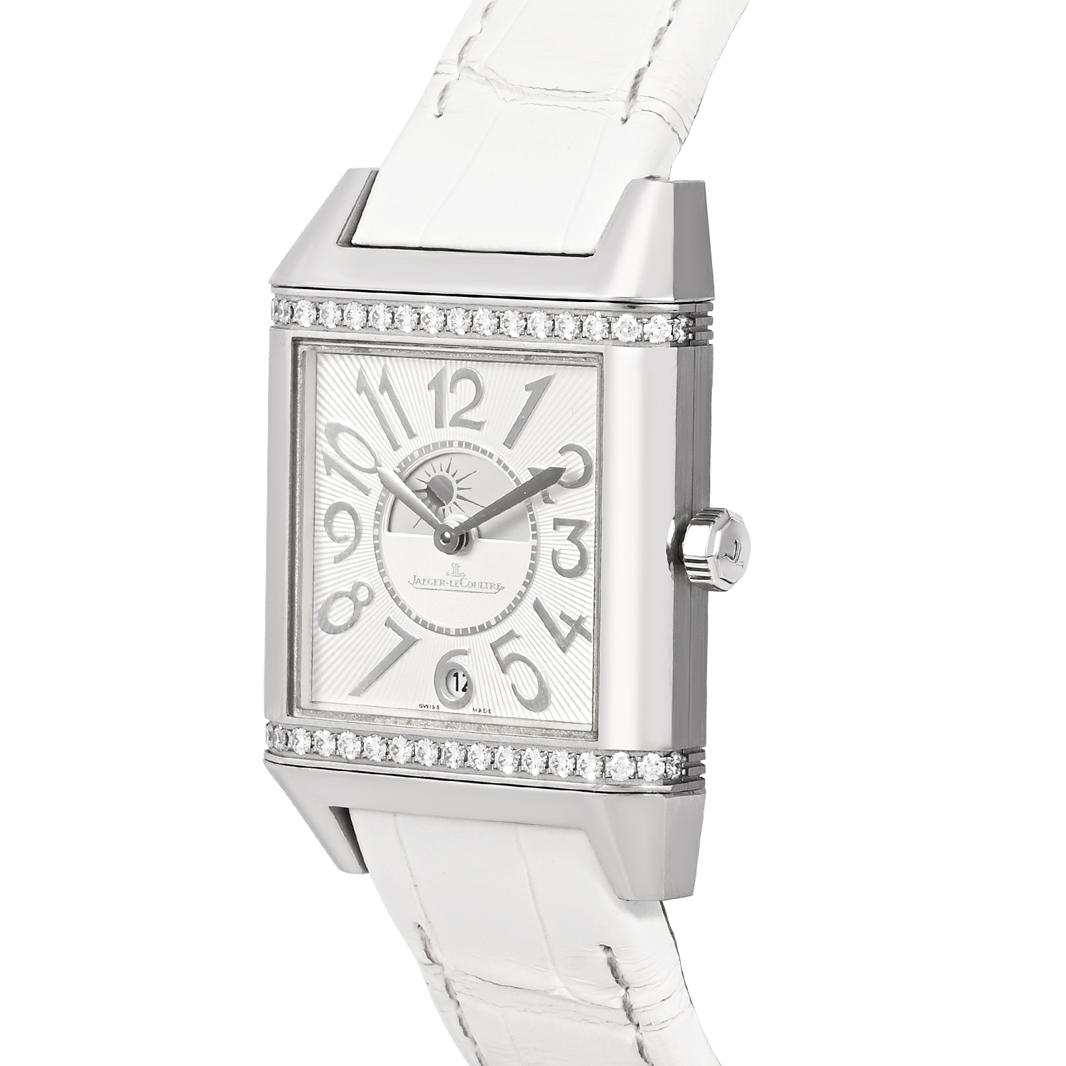 The Jaeger-LeCoultre Reverso Squadra Lady Duetto is a refined expression of Art Deco elegance and technical ingenuity, featuring the iconic reversible case designed for versatility and style. Its compact 28.8mm stainless steel case is accented with diamonds, framing a graceful silver dial with distinctive numerals and feminine detailing. Paired with a white leather strap, this Reverso is powered by a precision manual-winding movement, offering dual-face sophistication and timeless charm for the modern woman who appreciates heritage, elegance, and innovation.
