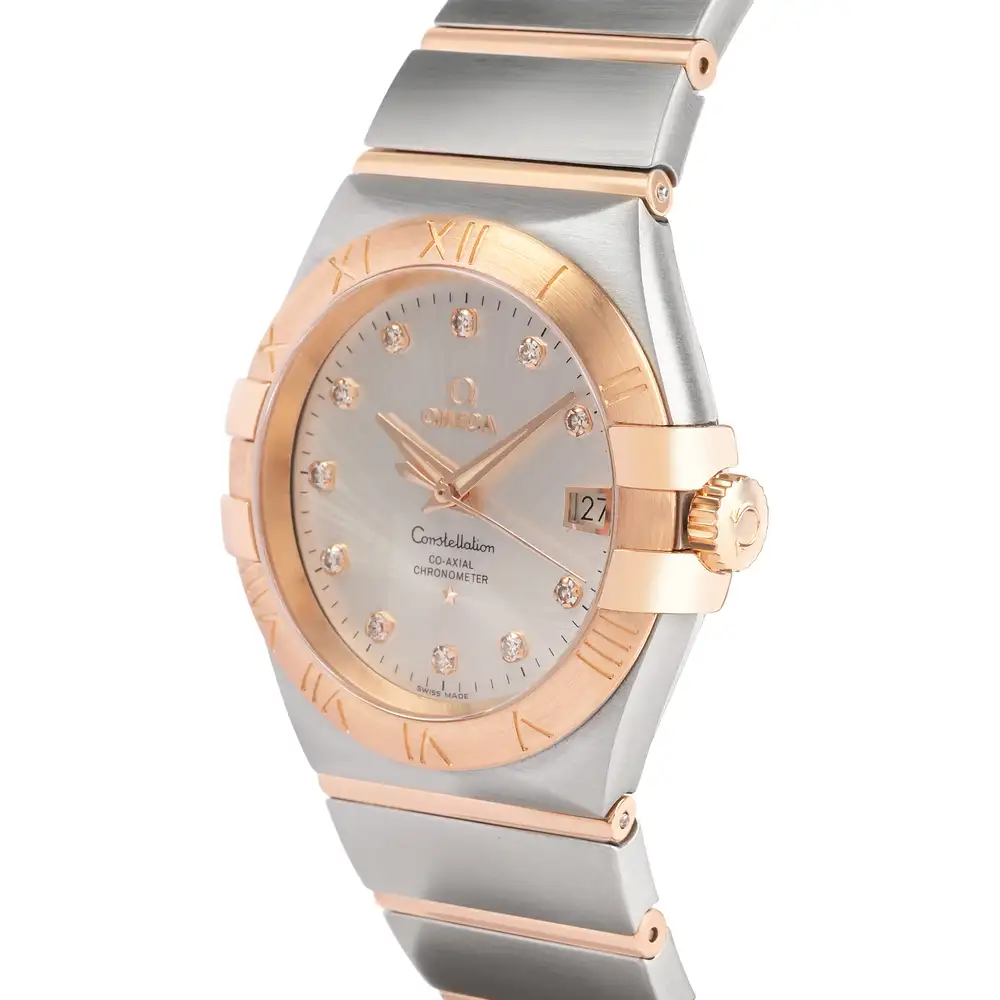 The Omega Constellation 123.20.35.20.52.001 exudes luxury and elegance. Its 35mm stainless steel case, accented with 18ct Sedna™ gold, frames a diamond-set dial with iconic Constellation design elements. Powered by the Co-Axial Master Chronometer Caliber 8800, it offers exceptional precision, a 55-hour power reserve, and anti-magnetic performance up to 15,000 gauss. A timeless blend of sophistication and technical mastery.