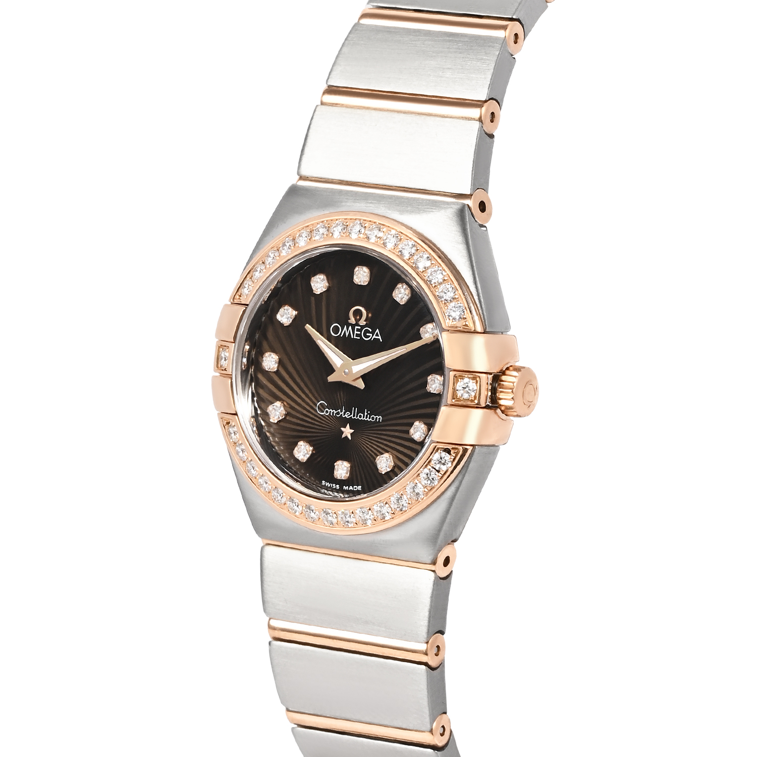 The OMEGA Constellation 123.25.27.60.63.002 is a refined women’s luxury watch that blends iconic Constellation design with elegant diamond detailing. It features a rich chocolate dial set with diamond hour markers, paired with the signature Constellation claws and a diamond-set bezel for a glamorous finish. The 27mm case and integrated bracelet in stainless steel and OMEGA’s Sedna™ gold create a sophisticated two-tone look, making it perfect for everyday elegance as well as special occasions.