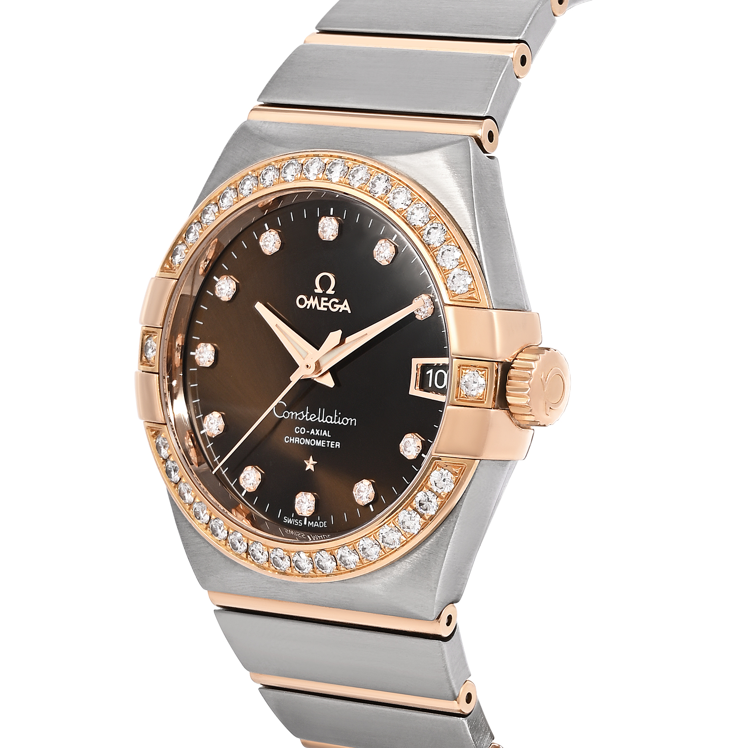The Constellation reference 123.25.38.21.63.001 showcases Omega’s signature design language with its integrated bracelet and distinctive “claws” on the case. Crafted in stainless steel and 18k Everose gold, the 38 mm case is elevated by a brilliant diamond-set bezel. The chocolate brown dial is adorned with diamond hour markers, offering warmth and refined sparkle. Powered by the Co-Axial Master Chronometer Calibre 8800, it delivers outstanding precision, anti-magnetic resistance, and reliability.