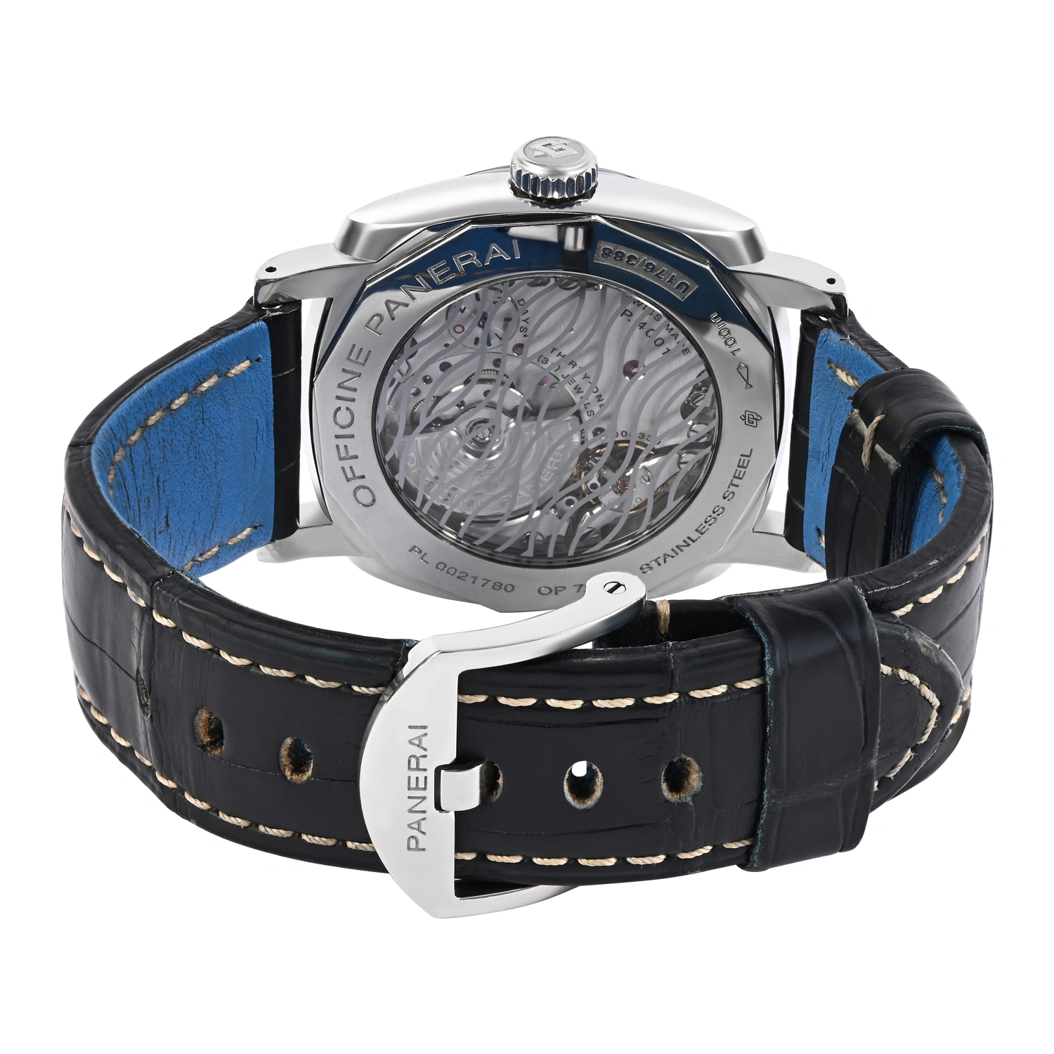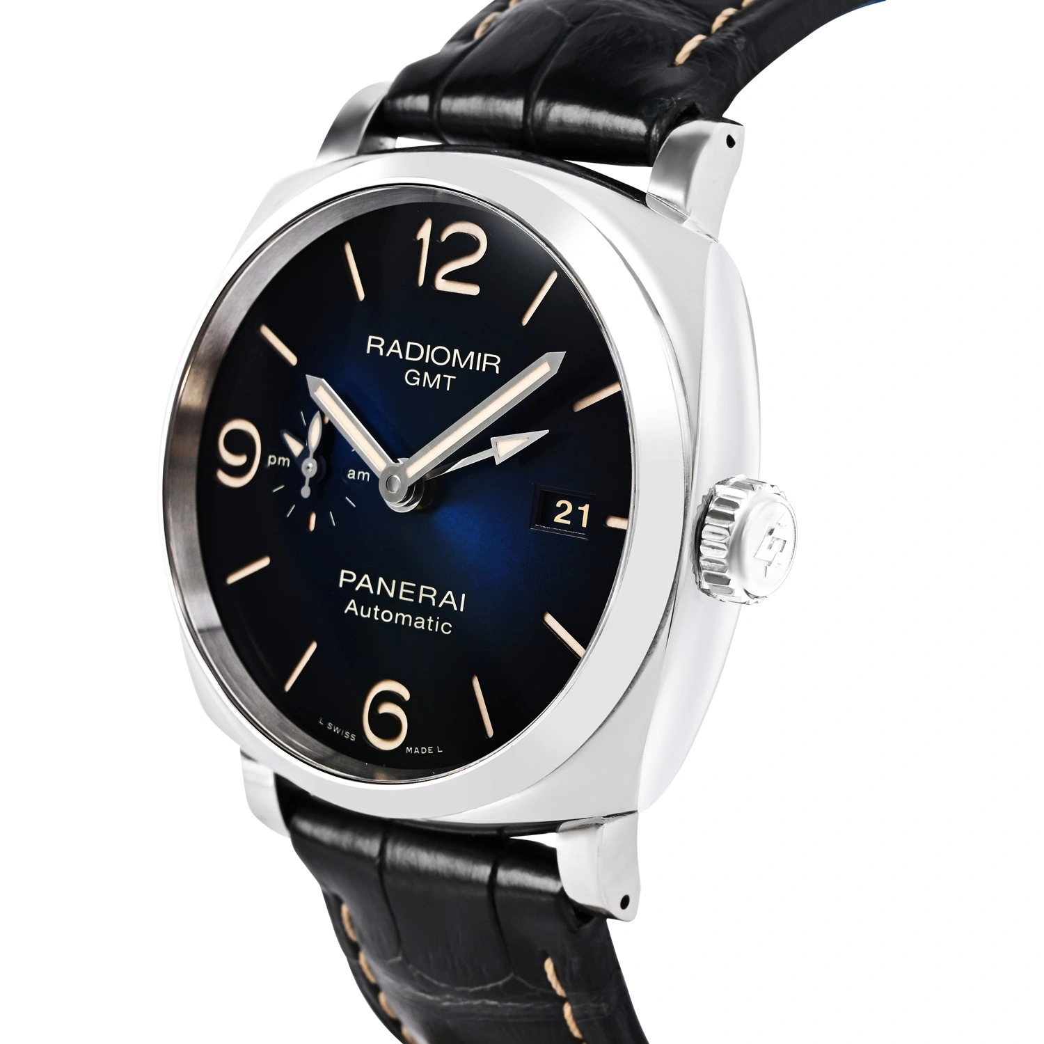 The Panerai Radiomir GMT PAM00945 features a striking 45mm stainless steel cushion case and a luminous blue sunburst dial. Powered by the automatic P.4002 calibre, it includes GMT, date, AM/PM indicator, and small seconds. A refined blend of Panerai heritage and modern complications.
