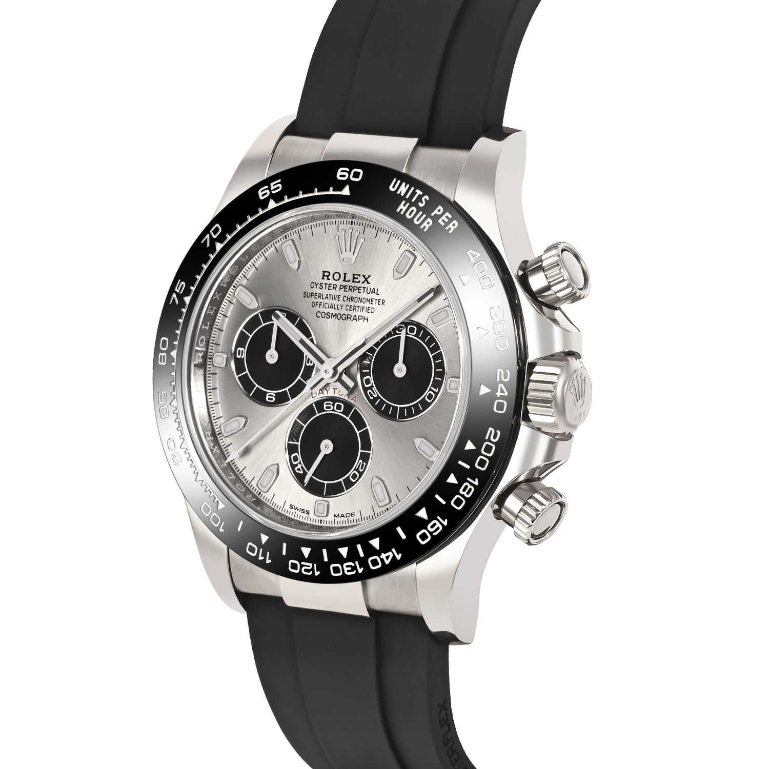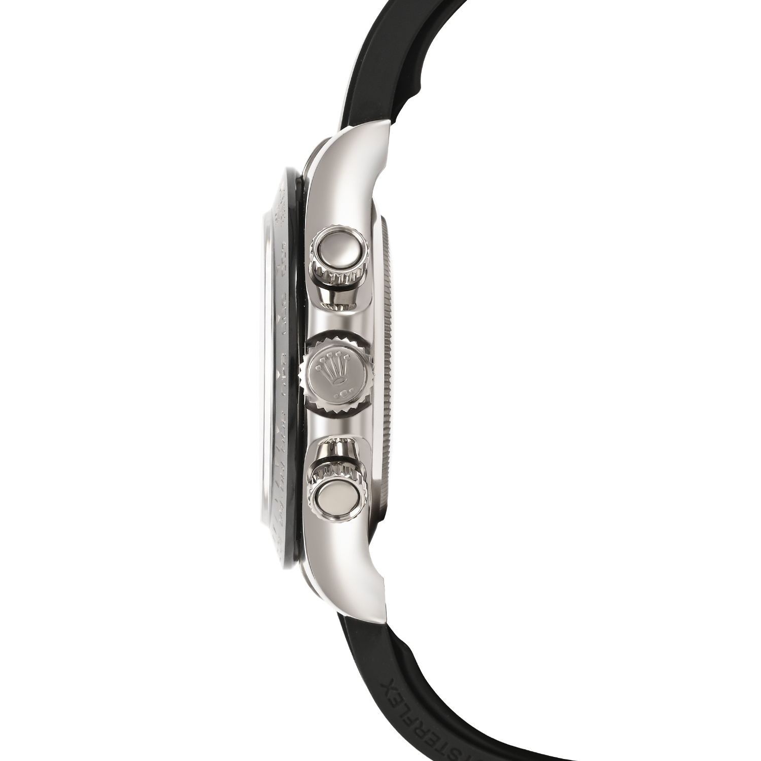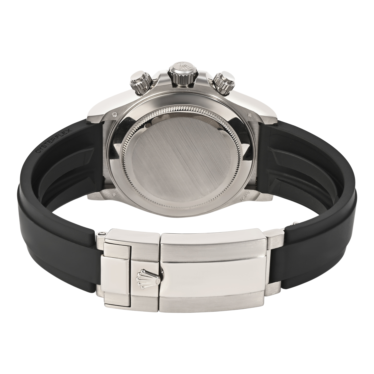 The Rolex Daytona 116519LN in 18K white gold paired with the Oysterflex bracelet offers a modern interpretation of a classic chronograph. Its 40mm case is complemented by a black Cerachrom ceramic bezel with an engraved tachymeter scale, enhancing both durability and sporty appeal. The sleek dial with contrasting sub-dials ensures excellent legibility, while the innovative Oysterflex strap combines the robustness of metal with the comfort of elastomer. Powered by the in-house Caliber 4130, this timepiece delivers exceptional precision, reliability, and contemporary style.
