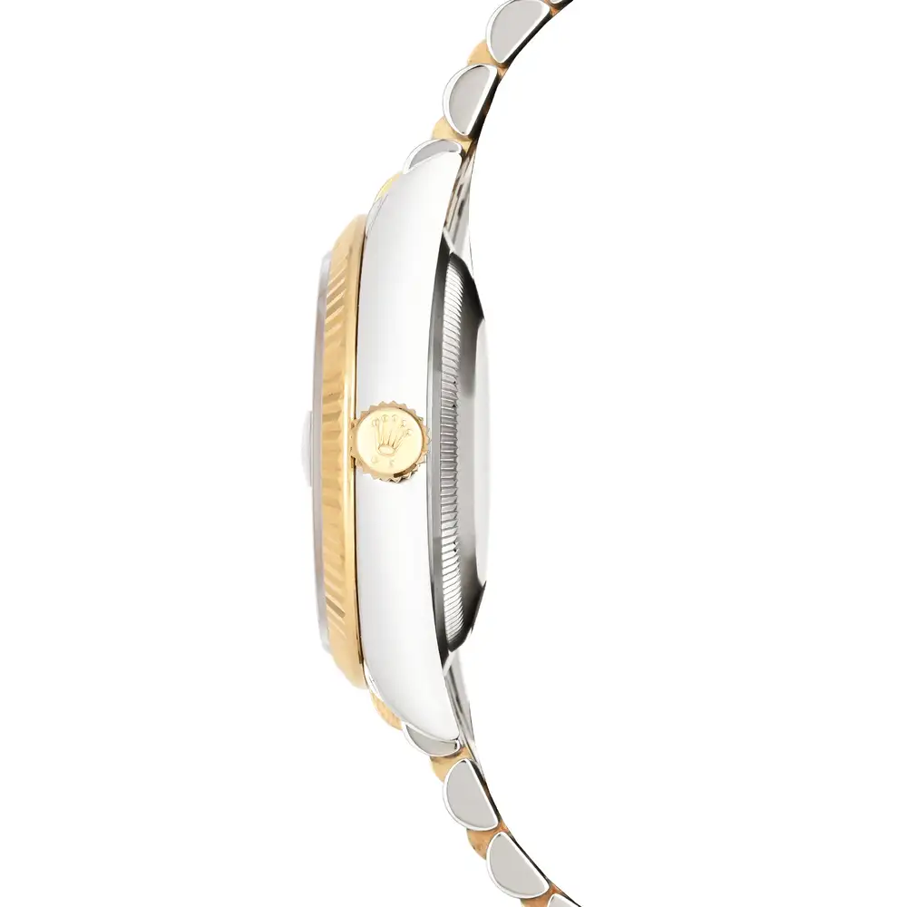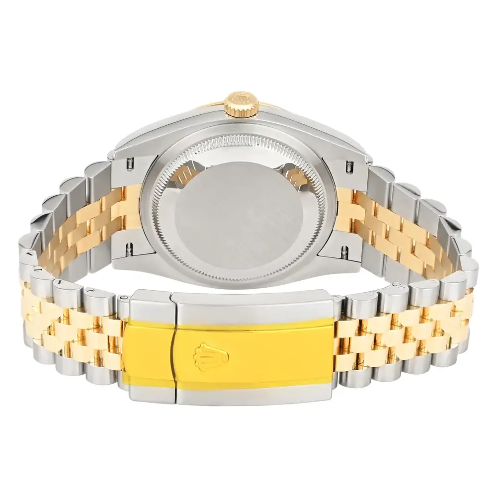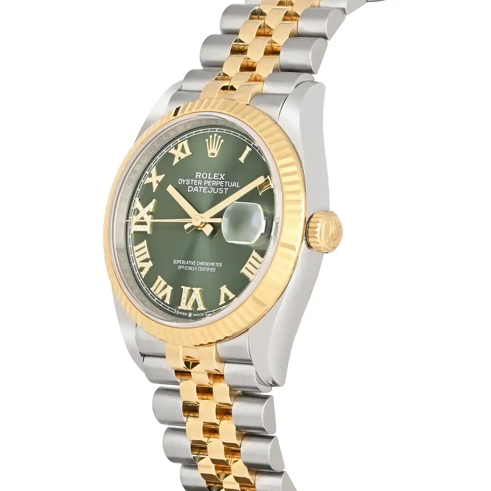 The Rolex Datejust 126233 features a stunning olive green dial adorned with diamond markers at the VI and IX positions, beautifully housed in a combination of stainless steel and 18K yellow gold. With its elegant fluted bezel and classic Jubilee bracelet, this luxurious timepiece exudes sophistication and timeless charm, making it perfect for any occasion.