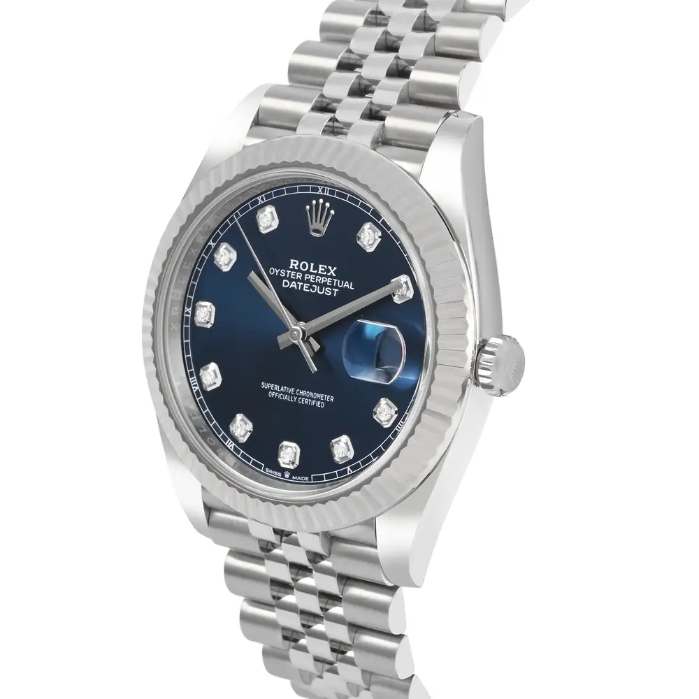 The Rolex Datejust 126334 is a timeless symbol of refinement and precision. Its 41mm Oystersteel case is complemented by a fluted white gold bezel and a stunning blue dial set with diamond hour markers. Powered by the Caliber 3235, it offers a 70-hour power reserve and superior chronometric accuracy. A perfect blend of elegance and technical excellence, crafted for those who appreciate enduring luxury.