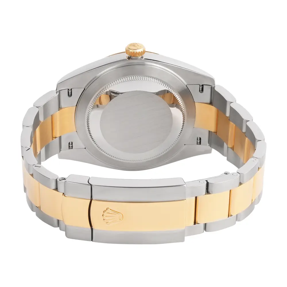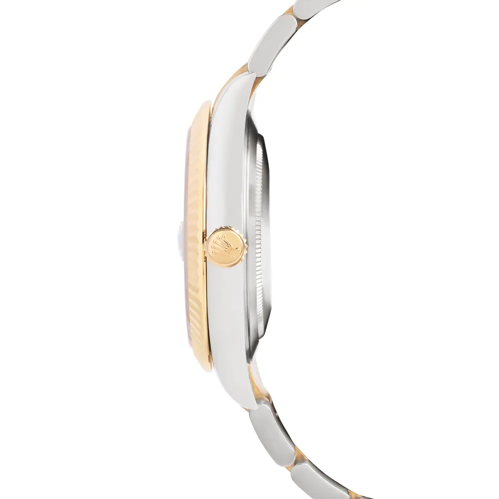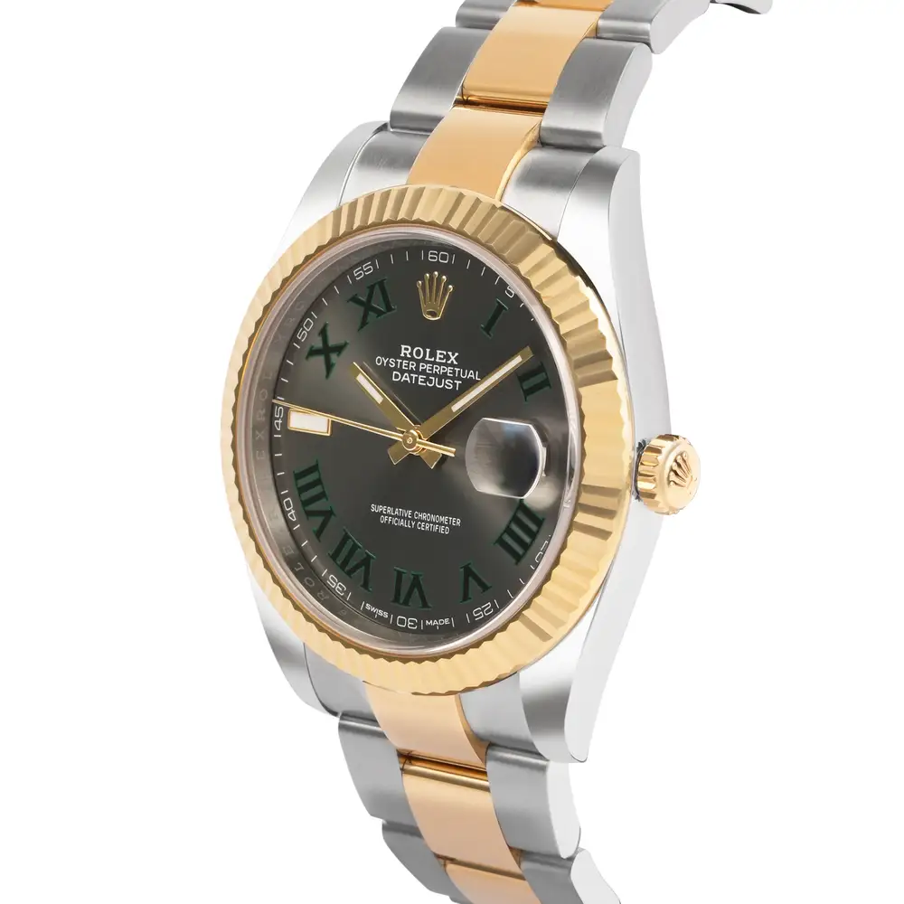 The Rolex Datejust 126333 blends sporty elegance with timeless sophistication. Its 41mm Oystersteel and 18ct yellow gold case frames a black dial with green Roman numerals, famously known as the Slate dial, paired with a fluted bezel. Powered by the Caliber 3235, it offers superior precision, a 70-hour power reserve, and 100m water resistance. A luxurious expression of style and Rolex craftsmanship.