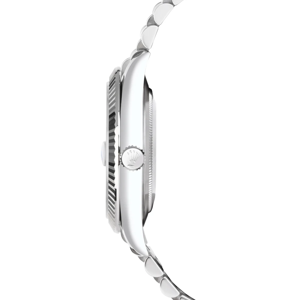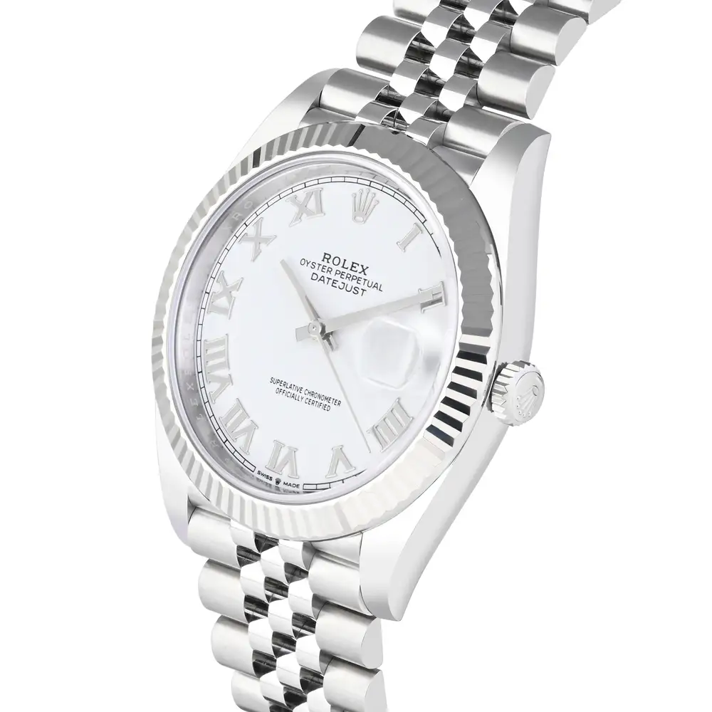 A refined 41mm Rolex Datejust with a clean white Roman numeral dial, paired with a Jubilee bracelet for iconic comfort and style. The 18k white gold fluted bezel adds a luxurious touch, while the Calibre 3235 movement offers precision and durability for everyday wear. A perfect balance of elegance and modern performance.