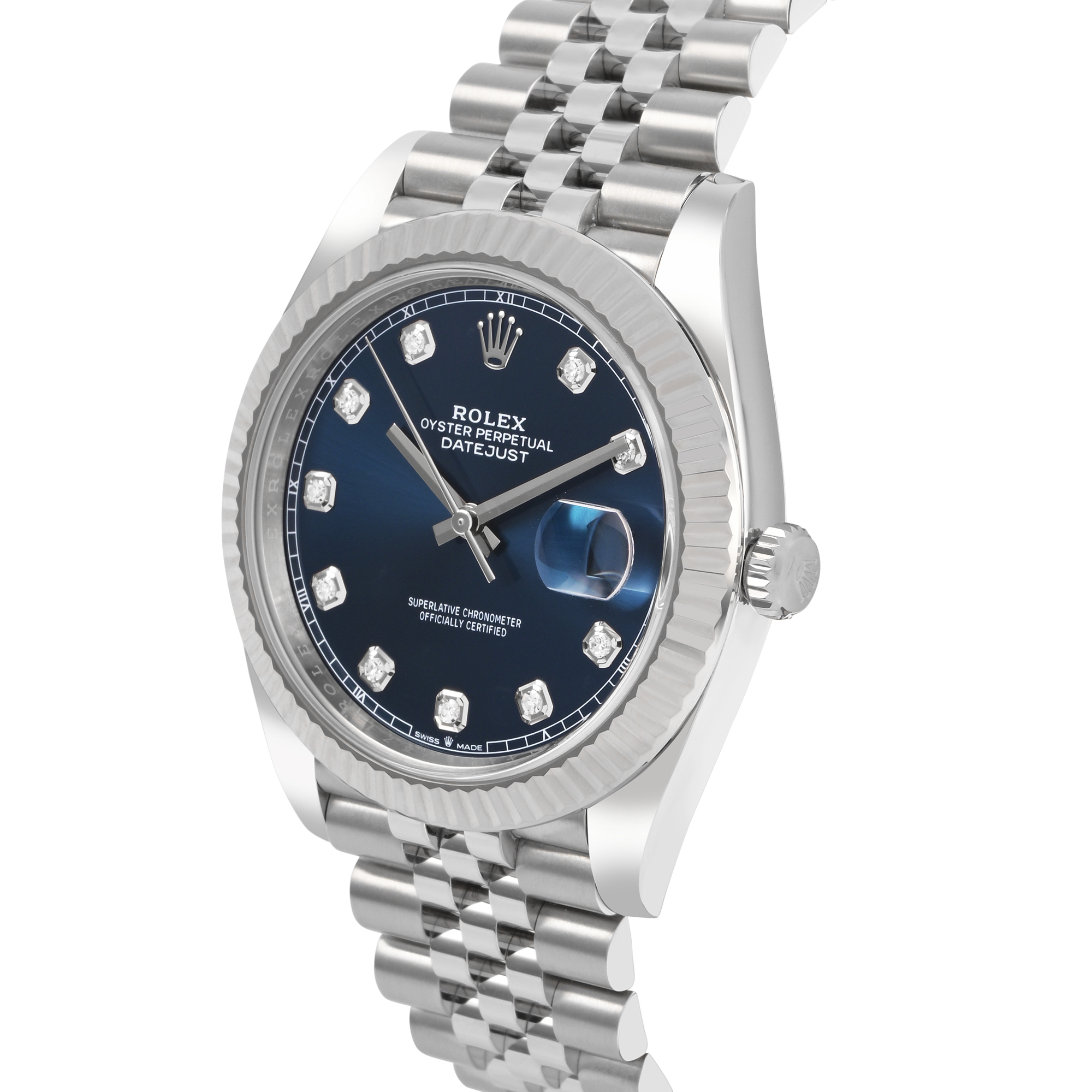 The Datejust reference 126334 represents a modern interpretation of Rolex’s enduring design. Crafted in Oystersteel with an 18k white gold fluted bezel, the 41 mm case offers a confident yet versatile wrist presence. The bright blue sunburst dial adds depth and character, enhanced by diamond hour markers for added refinement. Powered by the Calibre 3235 and paired with the Jubilee bracelet, it ensures exceptional precision, comfort, and long-term reliability.