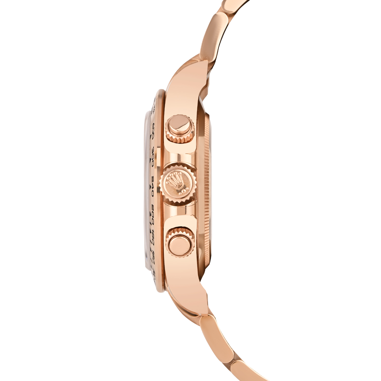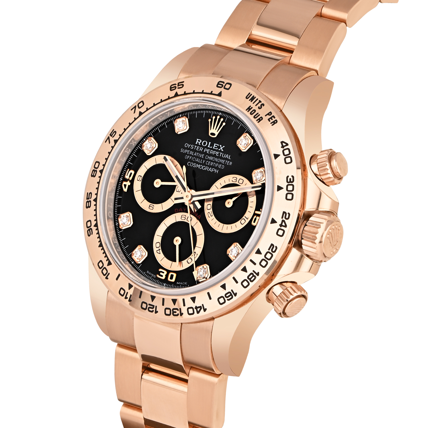 The Rolex Cosmograph Daytona 116505 exudes pure prestige, crafted in 18ct Everose gold with a striking bright black dial adorned with diamond hour markers. Its iconic 40mm case is paired with the Everose gold Oyster bracelet and a tachymeter bezel, embodying Rolex’s legendary racing heritage. Powered by the in-house Caliber 4130 chronograph movement, this Daytona seamlessly blends high-performance precision with unmistakable luxury and enduring elegance.