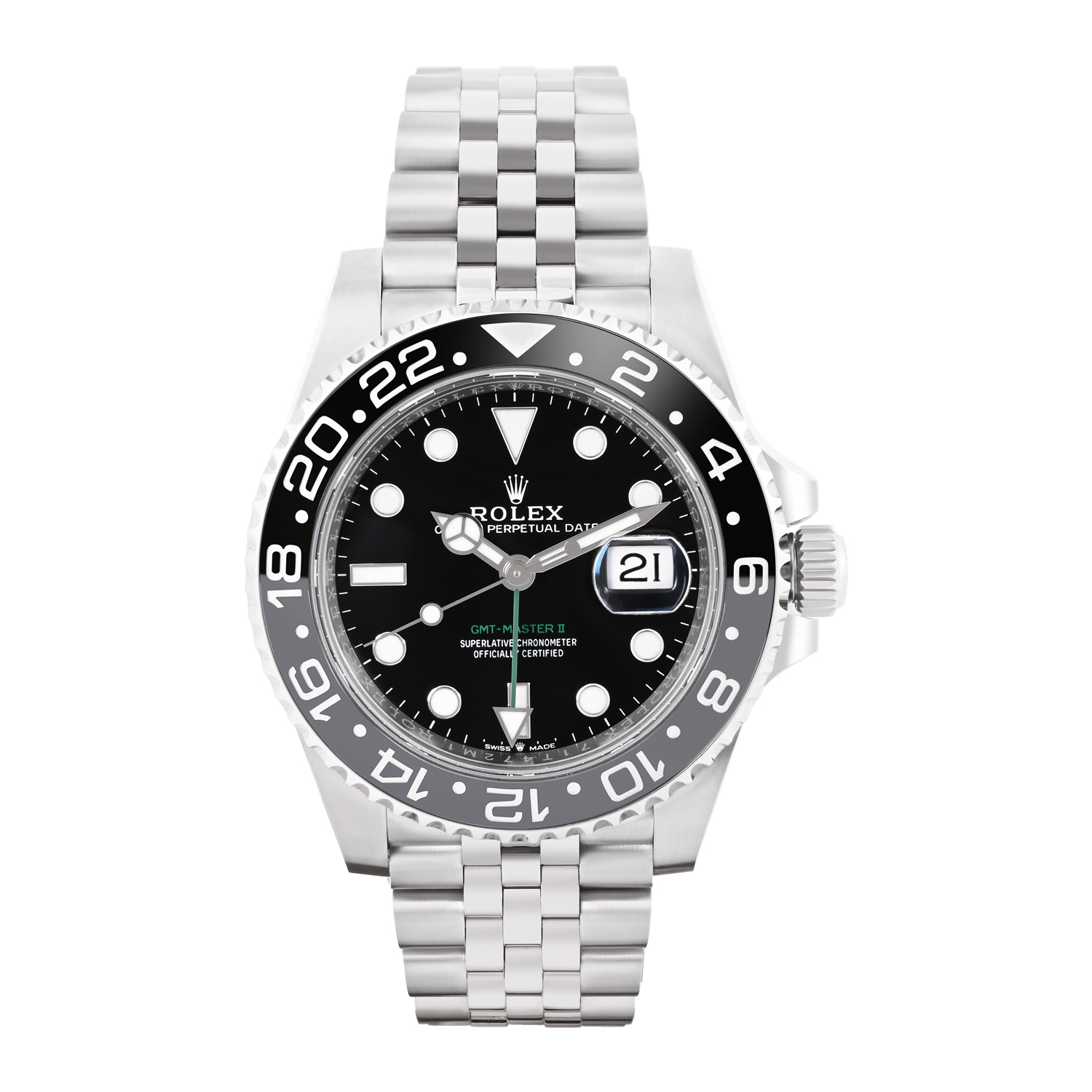 The Rolex GMT-Master II 126710GRNR features a black dial paired with the new black & grey ceramic bezel insert. Powered by the Rolex Calibre 3285, it offers dual-time capability for travelers, complete with a 40mm Oystersteel case and Jubilee bracelet. A perfect blend of modern engineering and iconic GMT design.