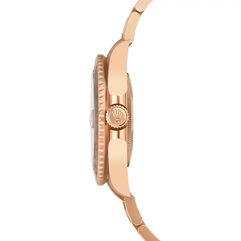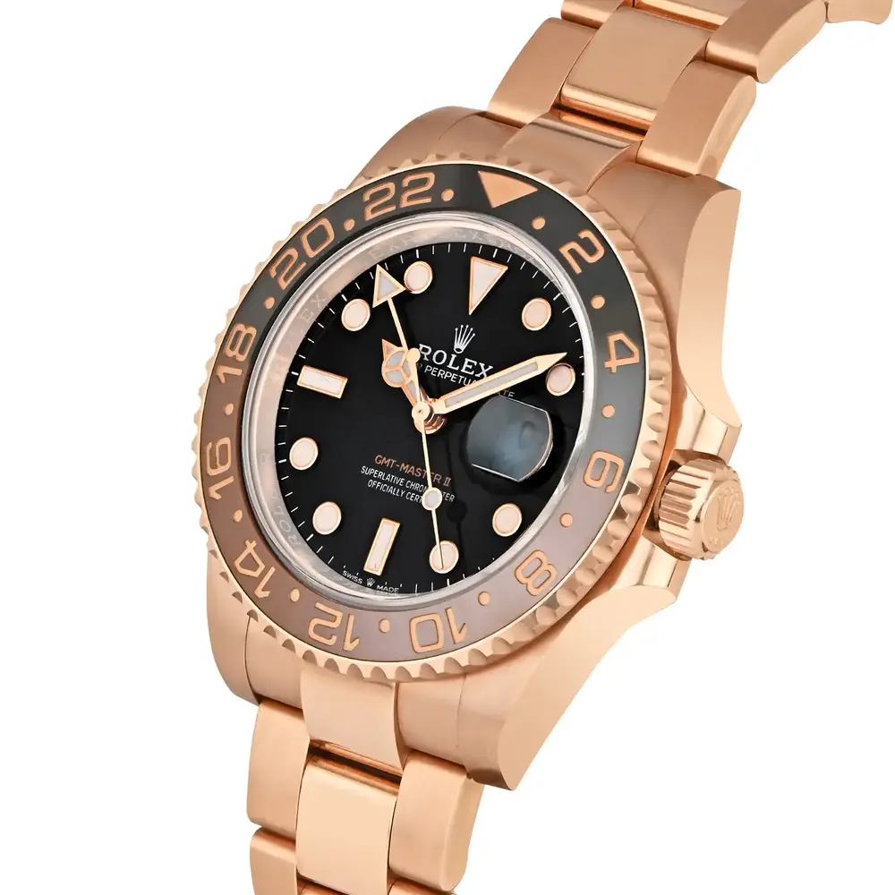 The Rolex GMT-Master II 126715CHNR is a luxurious full rose gold timepiece that exudes elegance and sophistication, featuring a striking black and brown ceramic bezel. With its dual time zone functionality and iconic design, this watch is the perfect companion for the discerning traveler who appreciates both style and performance.