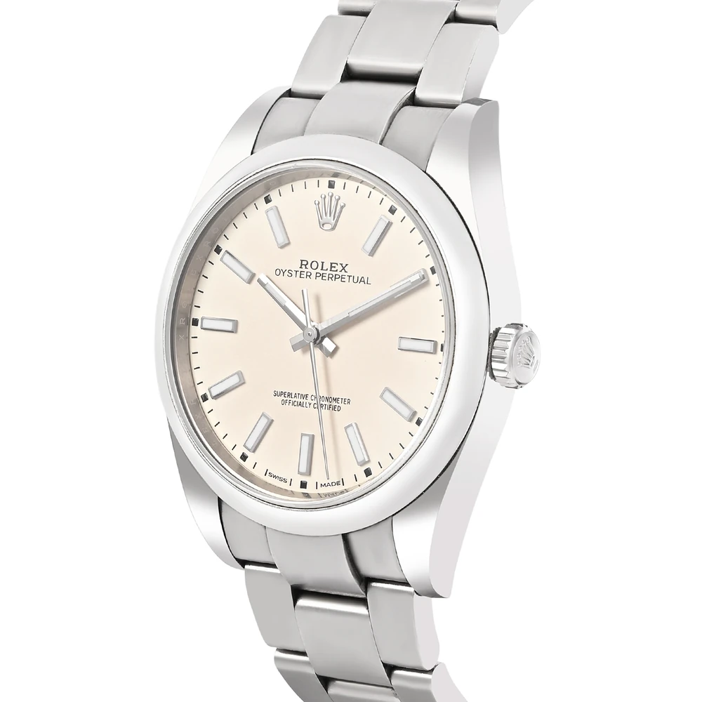The Rolex Oyster Perpetual 39 ref. 124300 showcases timeless Rolex minimalism, featuring a sleek Oystersteel case paired with a classic white dial for a clean and versatile aesthetic. Its balanced 39mm proportions offer contemporary presence while maintaining everyday wearability. Powered by the Rolex Caliber 3230, this timepiece delivers exceptional precision, robustness, and reliability, making it a perfect expression of understated elegance and enduring Rolex craftsmanship.