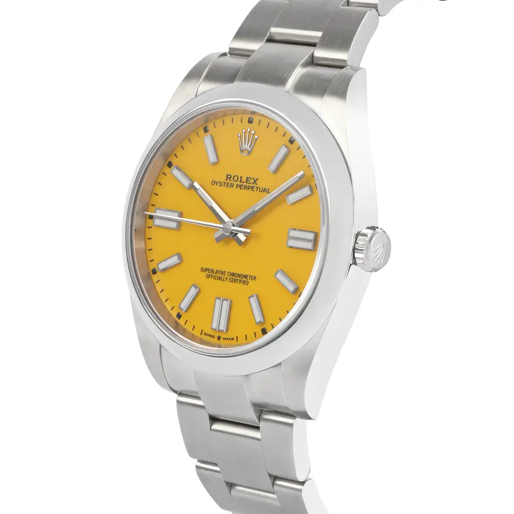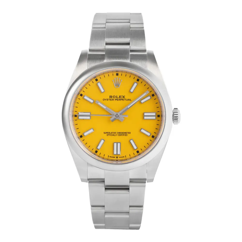The Rolex Oyster Perpetual 124300 stands out with its vibrant yellow dial and timeless design. Crafted in Oystersteel, its 41mm case embodies durability and sophistication, paired with a smooth domed bezel and classic Oyster bracelet. Powered by the Caliber 3230, it offers superior precision, 70-hour power reserve, and 100m water resistance. A bold expression of modern Rolex style and technical excellence.