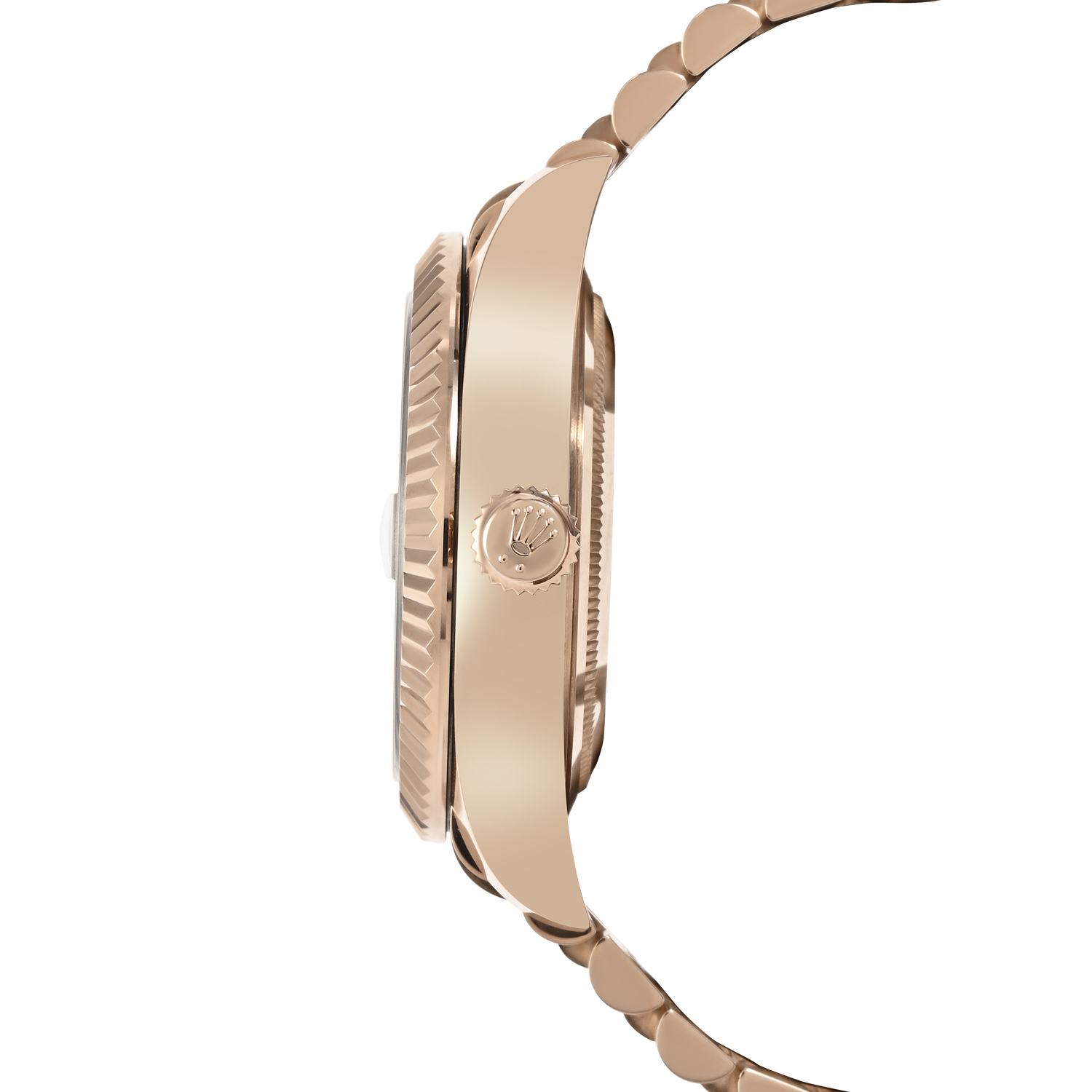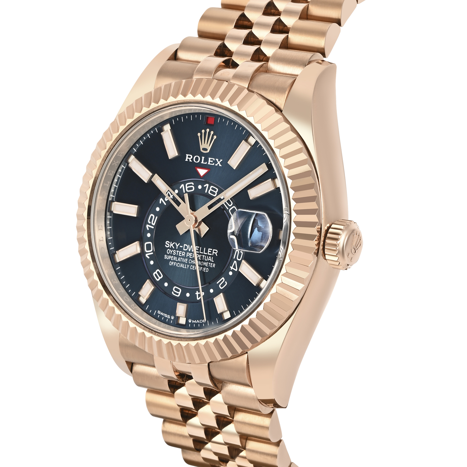 The Rolex Sky-Dweller 336935 in 18K Everose gold with a striking blue-green dial is a sophisticated travel watch combining innovation with luxury. Its 42mm case is paired with Rolex’s signature fluted bezel, which works seamlessly with the Ring Command system to control multiple functions. The vibrant dial features an off-center 24-hour disc and an annual calendar, offering exceptional functionality for frequent travelers. Powered by the advanced Caliber 9002 and finished with a Jubilee bracelet, this timepiece delivers precision, elegance, and cutting-edge engineering.