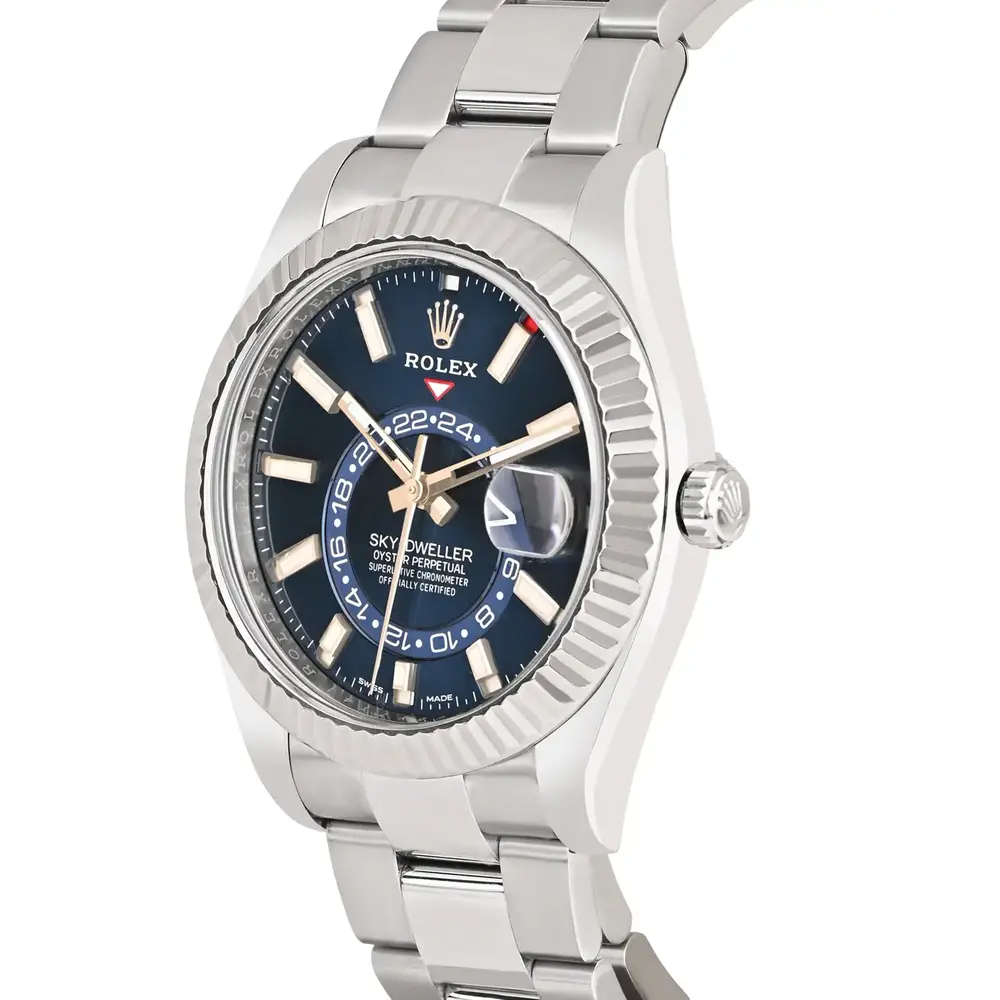 The Rolex Sky-Dweller 326934 features a stunning blue dial and a robust stainless steel case, complemented by an iconic Oyster bracelet for ultimate comfort and elegance. With its sophisticated annual calendar and dual time zone functionality, this luxurious watch is perfect for the modern traveler.
