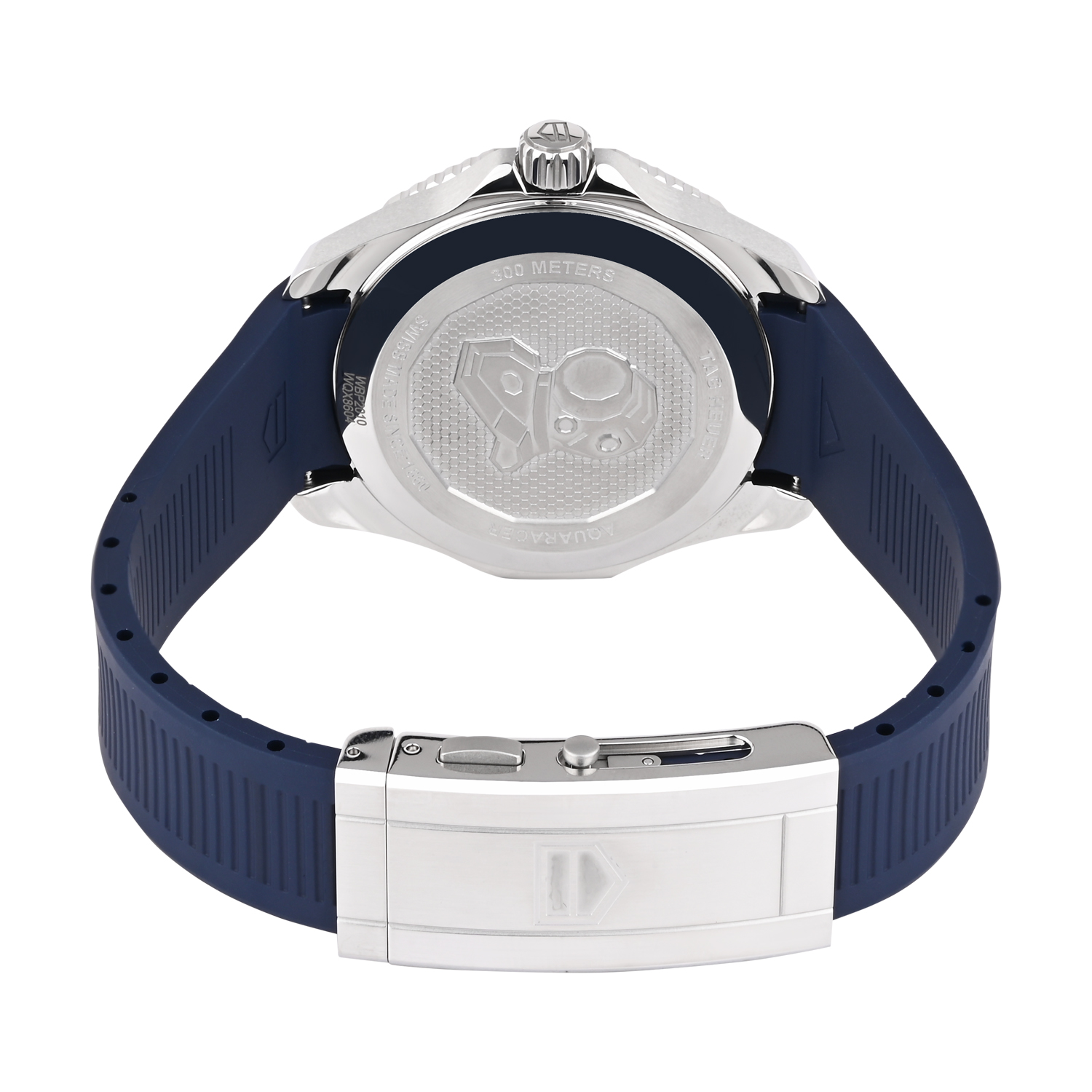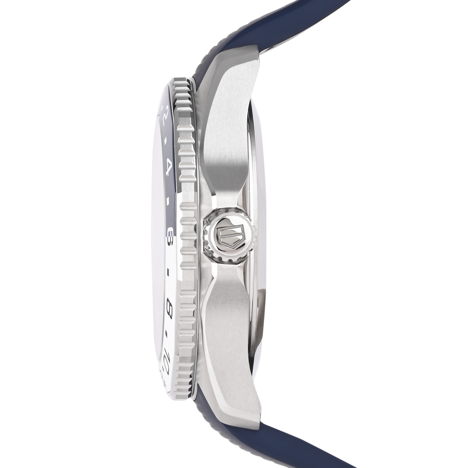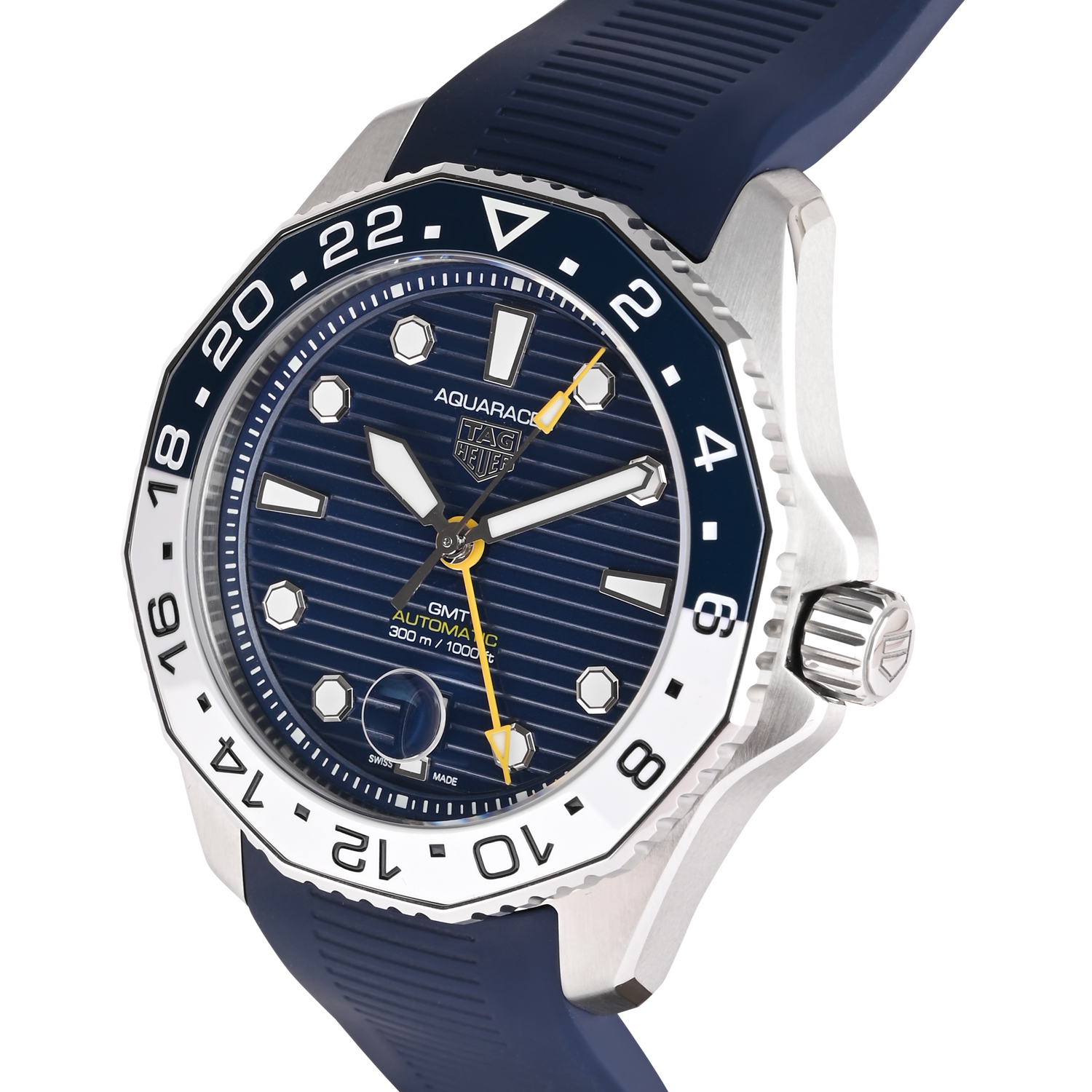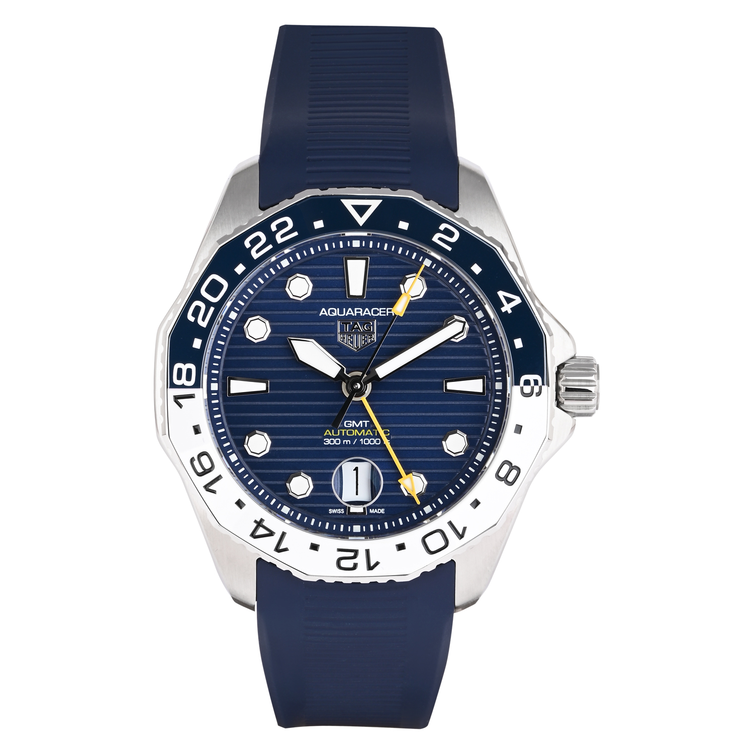 The TAG Heuer Aquaracer WBP2010 GMT is a sporty and travel-focused automatic watch designed for everyday performance. It features a deep blue striped dial with luminous markers and a contrasting GMT hand to track a second time zone. The two-tone 24-hour bezel adds bold character and practical functionality, while the comfortable blue rubber strap makes it ideal for active wear, travel, and water-ready lifestyle use.