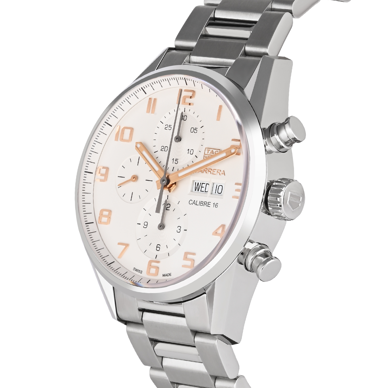 A refined and elegant Carrera chronograph featuring a clean silver dial with rose-gold tone hands and applied Arabic numerals for a premium, classic look. Powered by the Calibre 16 Swiss automatic movement, it includes chronograph sub-dials along with a practical day-date display, making it perfect for daily wear as well as formal occasions. Finished with a durable stainless steel case and matching bracelet for a timeless luxury feel.