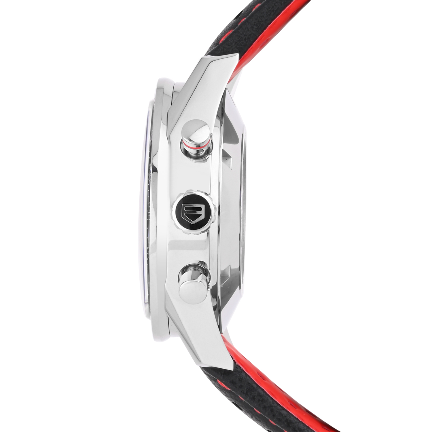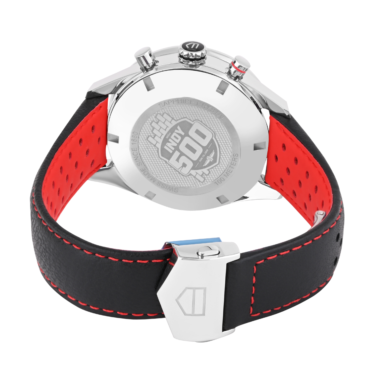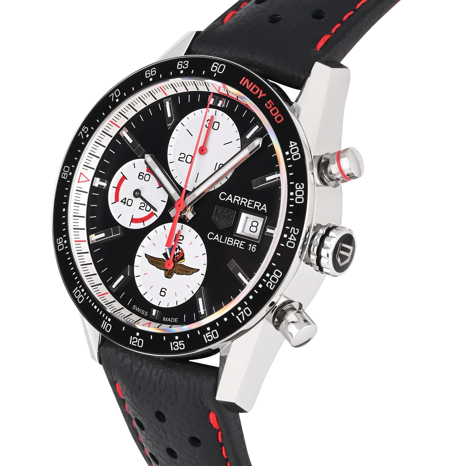A motorsport-inspired Carrera chronograph created in tribute to the Indy 500, featuring a bold black dial with contrasting white sub-dials, red racing accents, and the Indianapolis Speedway emblem on the dial. Powered by the Calibre 16 Swiss automatic chronograph movement, it offers precise timing, a date display, and a sporty perforated leather strap with red stitching for an authentic racing look.