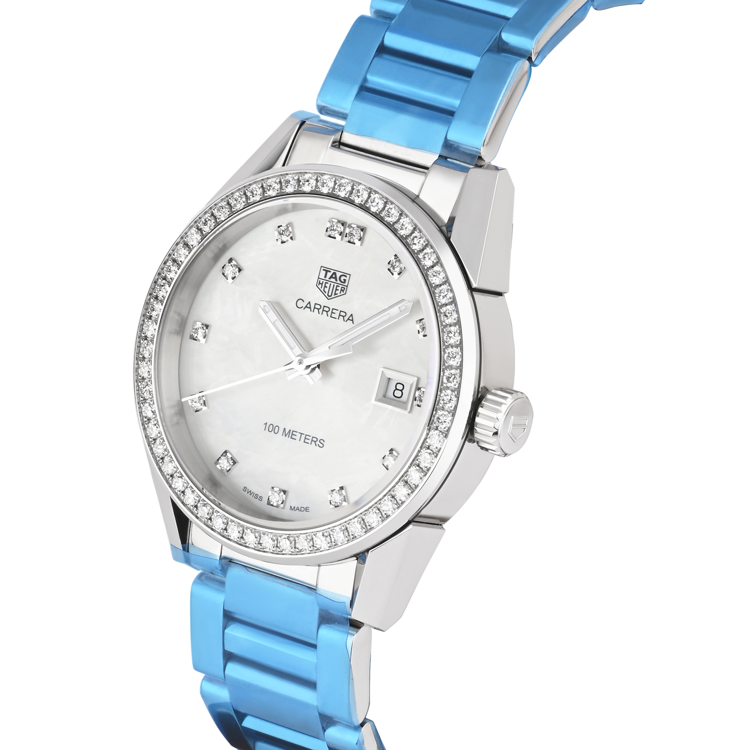 The TAG Heuer Carrera WBG1315 is an elegant ladies’ timepiece featuring a refined mother-of-pearl dial with diamond hour markers for a luxurious sparkle. A brilliant diamond-set bezel enhances the classic Carrera silhouette, while the sleek stainless steel case offers a timeless, versatile finish. Completed with a matching stainless steel bracelet, this watch is perfect for everyday sophistication, combining Swiss precision with jewellery-inspired design.