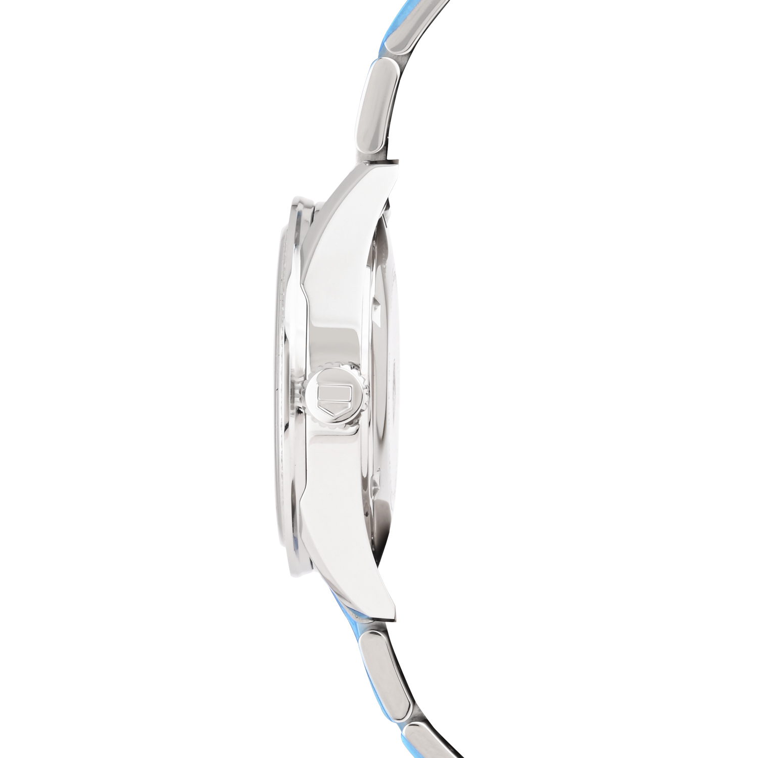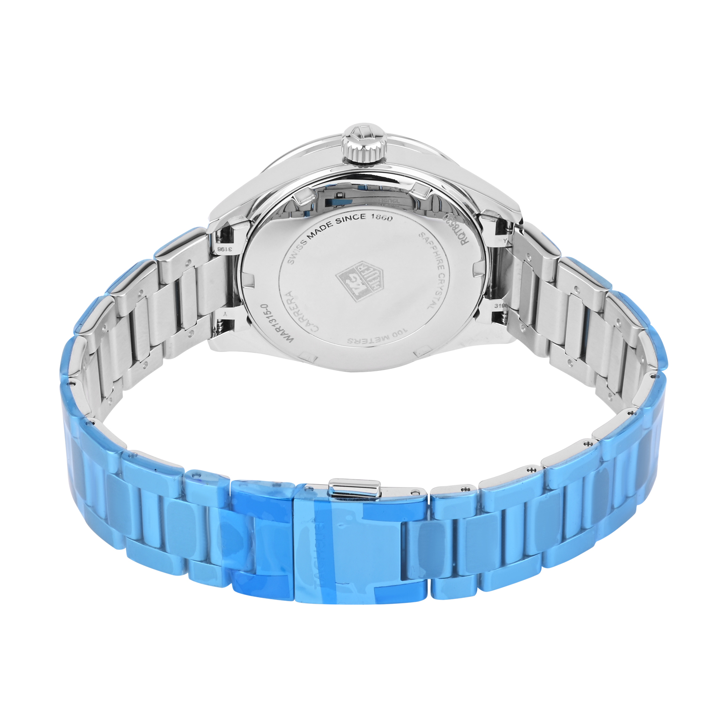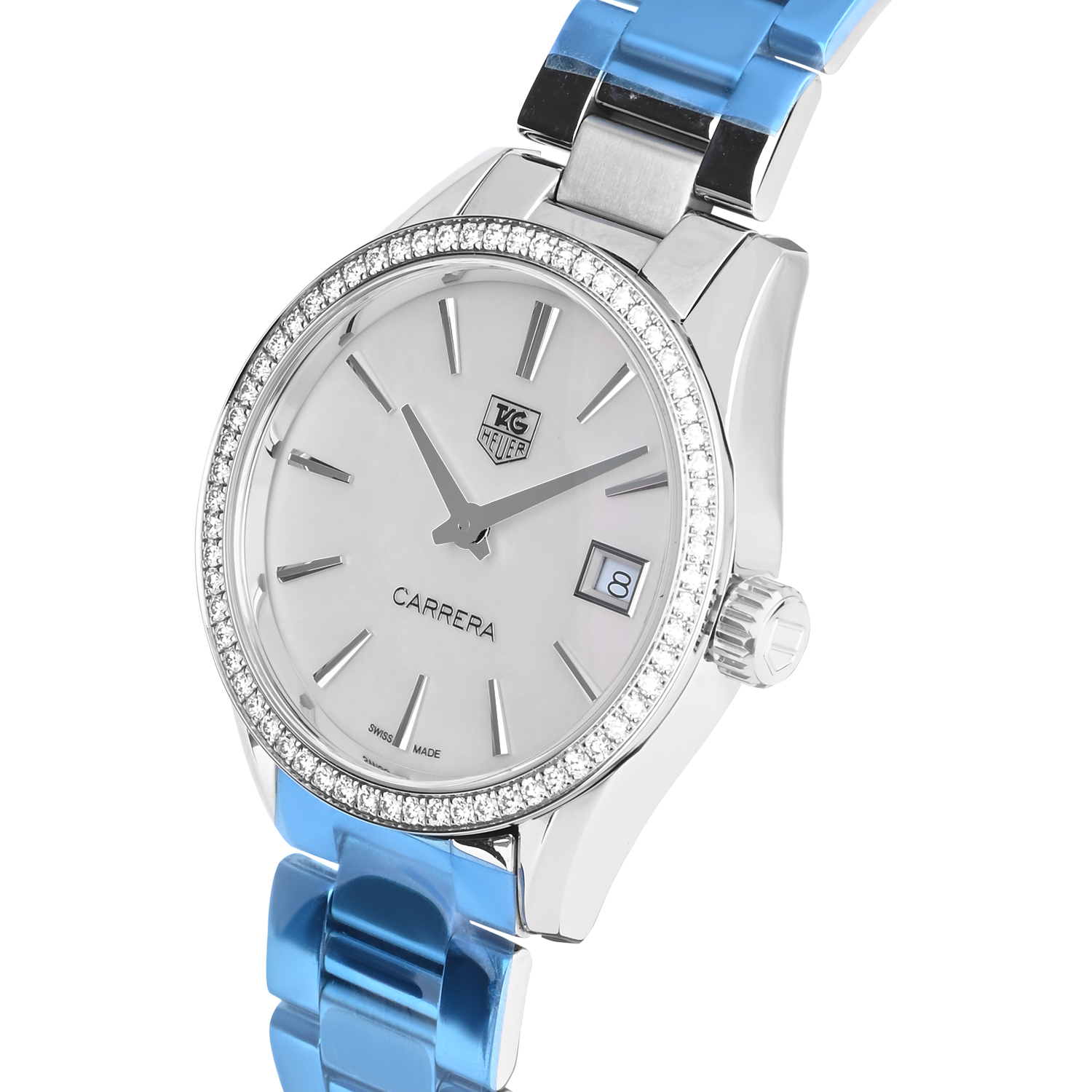 An elegant TAG Heuer Carrera crafted for refined everyday luxury. This timepiece features a shimmering silver dial with minimalist hour markers and a date window at 3 o’clock, paired with a sparkling diamond-set bezel for added sophistication. Powered by a precise Swiss quartz movement, it comes in a polished stainless steel case and bracelet, making it an ideal choice for formal occasions and premium daily wear.