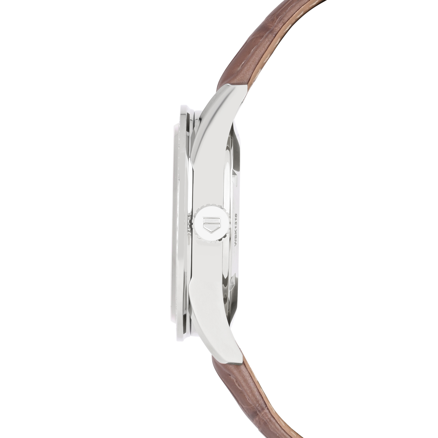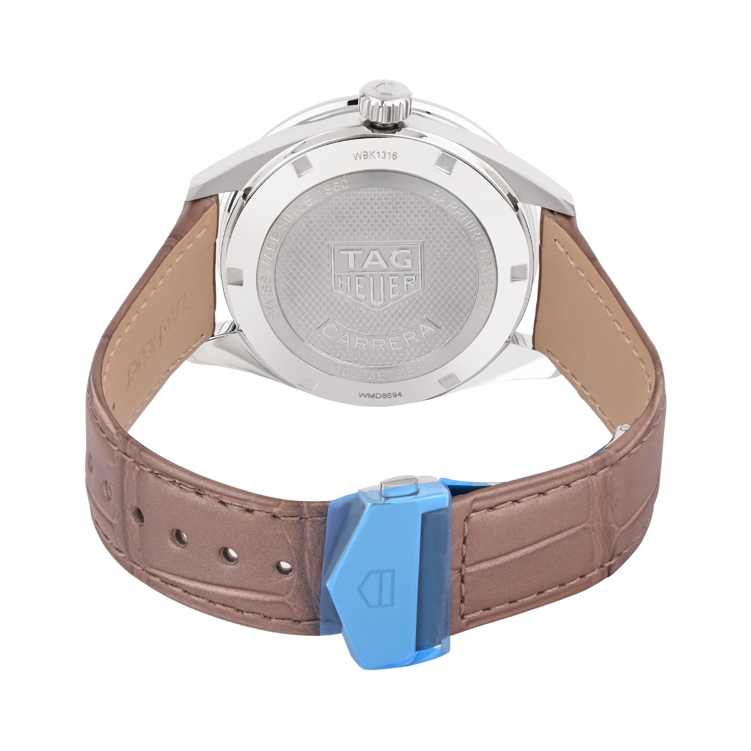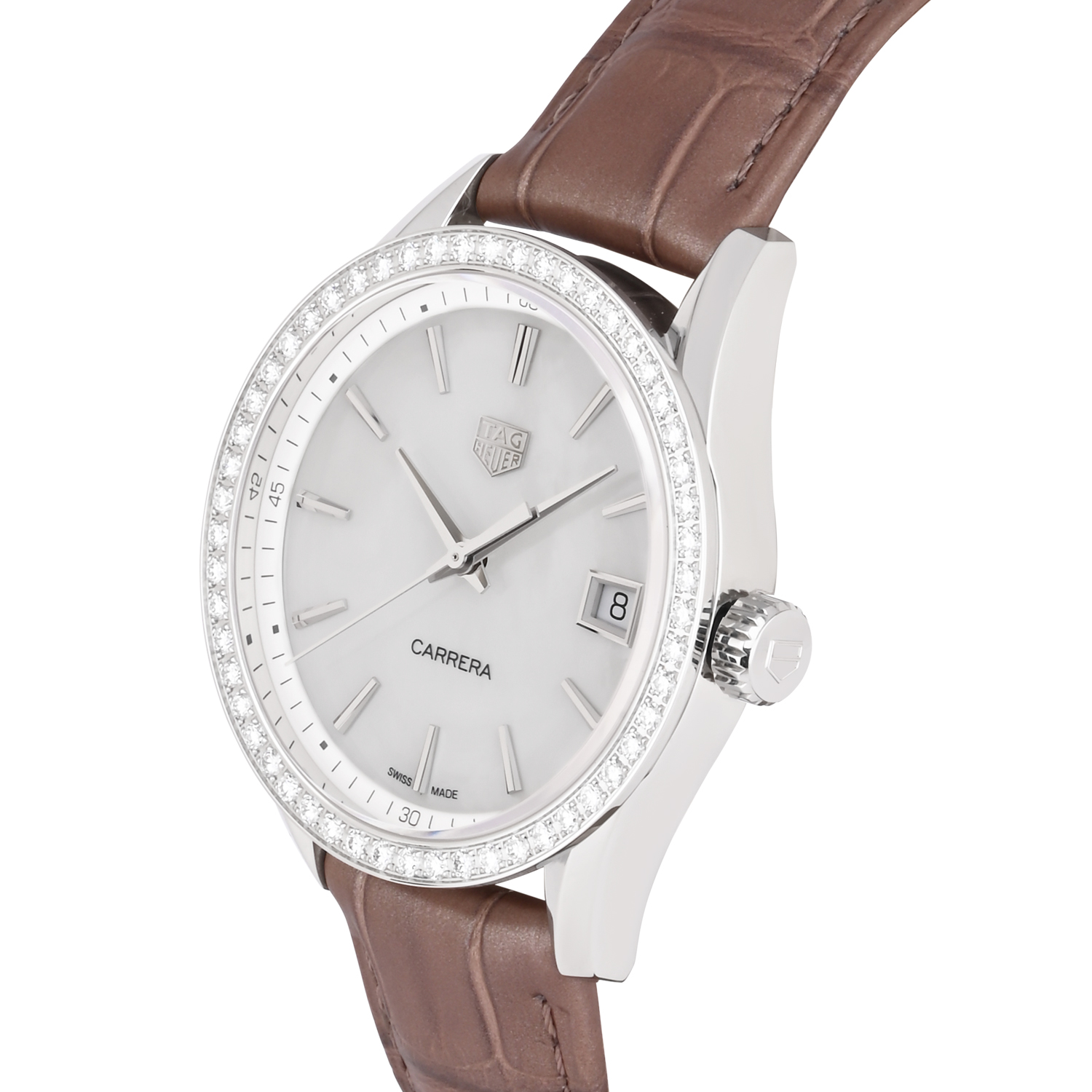 The TAG Heuer Carrera WBK1316 is an elegant women’s timepiece that pairs classic Carrera design with a touch of luxury. It features a clean white dial with slim hour markers and a practical date window, framed by a sparkling diamond-set bezel for added brilliance. Finished with a rich brown leather strap, this watch delivers a refined and sophisticated look—ideal for formal occasions as well as elevated everyday wear.