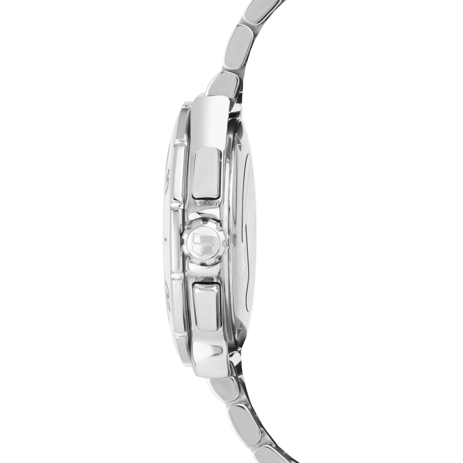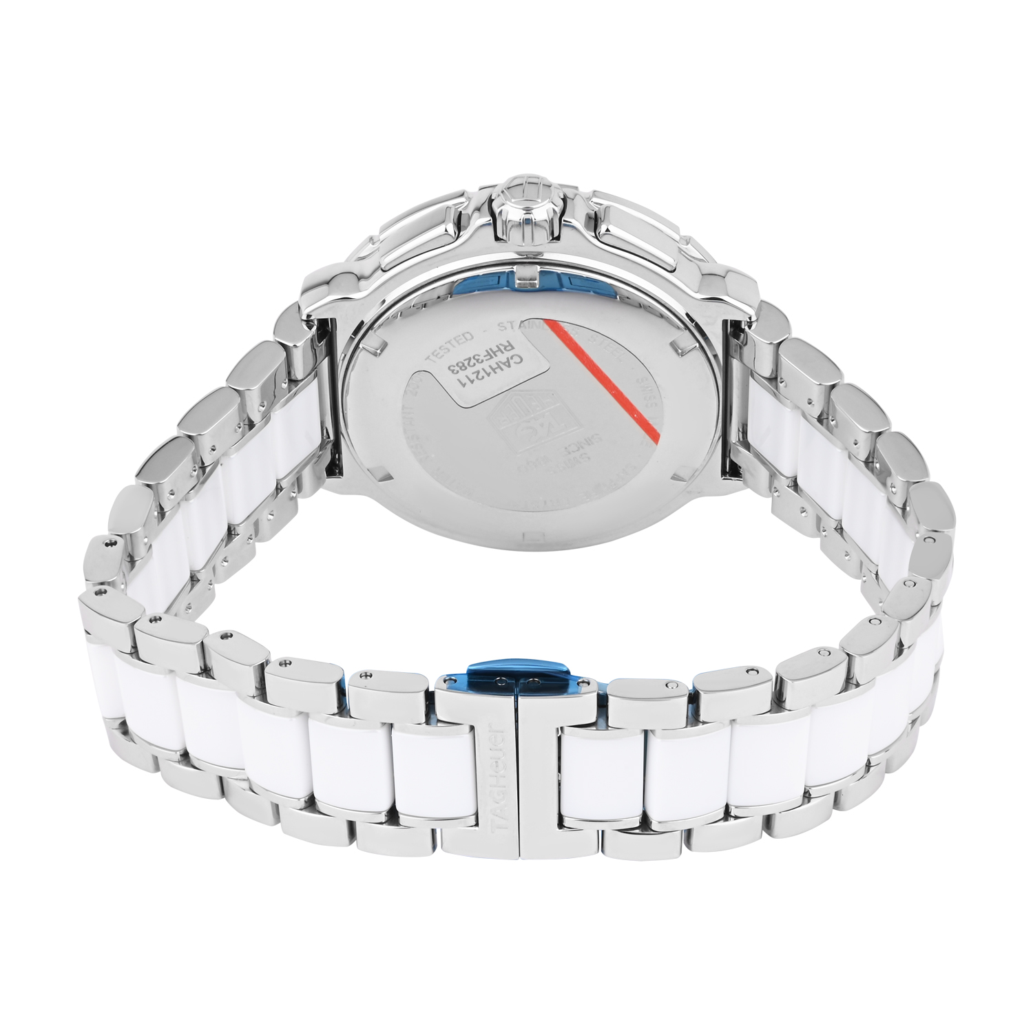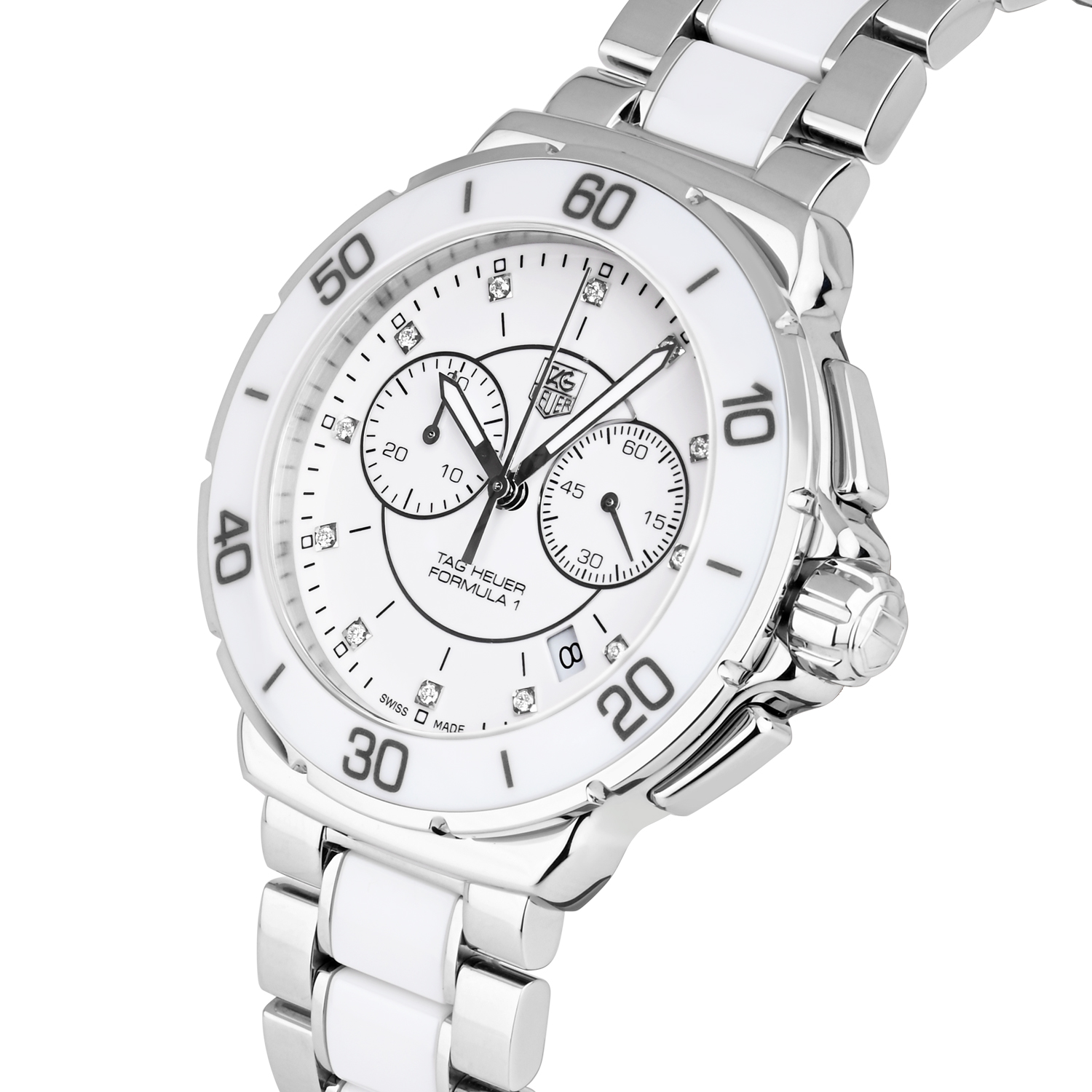 The TAG Heuer Formula 1 Chronograph is a sporty luxury timepiece designed with a clean white aesthetic and racing-inspired detailing. Featuring a white dial with diamond hour markers and two chronograph sub-dials, this watch delivers a bold yet elegant presence. The white ceramic bezel with large minute numerals enhances readability, while the stainless steel and white ceramic bracelet adds durability and premium finish. Powered by a reliable Swiss quartz chronograph movement and equipped with a date window, this Formula 1 is perfect for daily wear and stylish occasions.