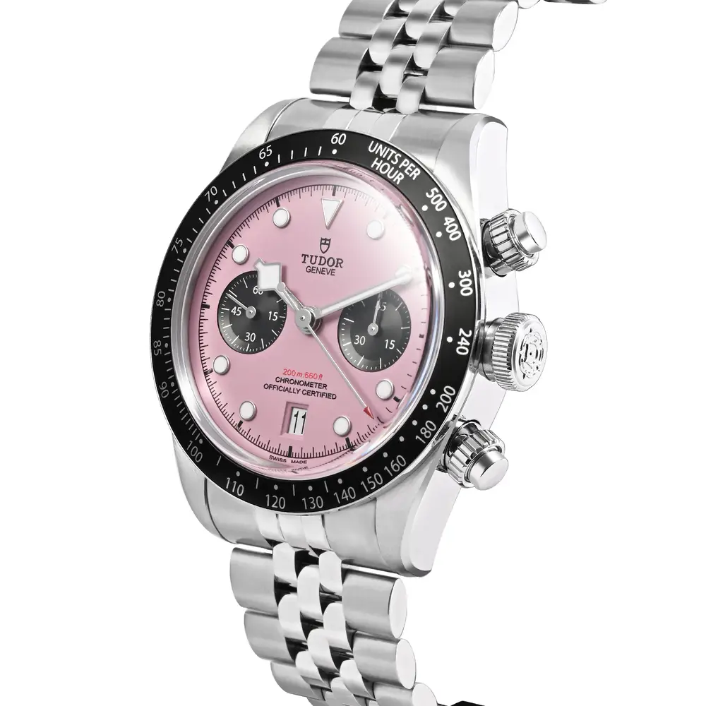 The Tudor Black Bay Chrono “Pink Dial” 79360N is a bold and collectible men’s sports chronograph that blends vintage-inspired racing aesthetics with modern performance. Its striking pink dial is paired with contrasting black sub-dials for a classic panda-style chronograph look, while the black tachymeter bezel adds a sharp motorsport edge. Built in stainless steel with a robust bracelet, this timepiece delivers everyday durability, a confident wrist presence, and chronograph functionality—perfect for enthusiasts who want something rare, sporty, and statement-making.