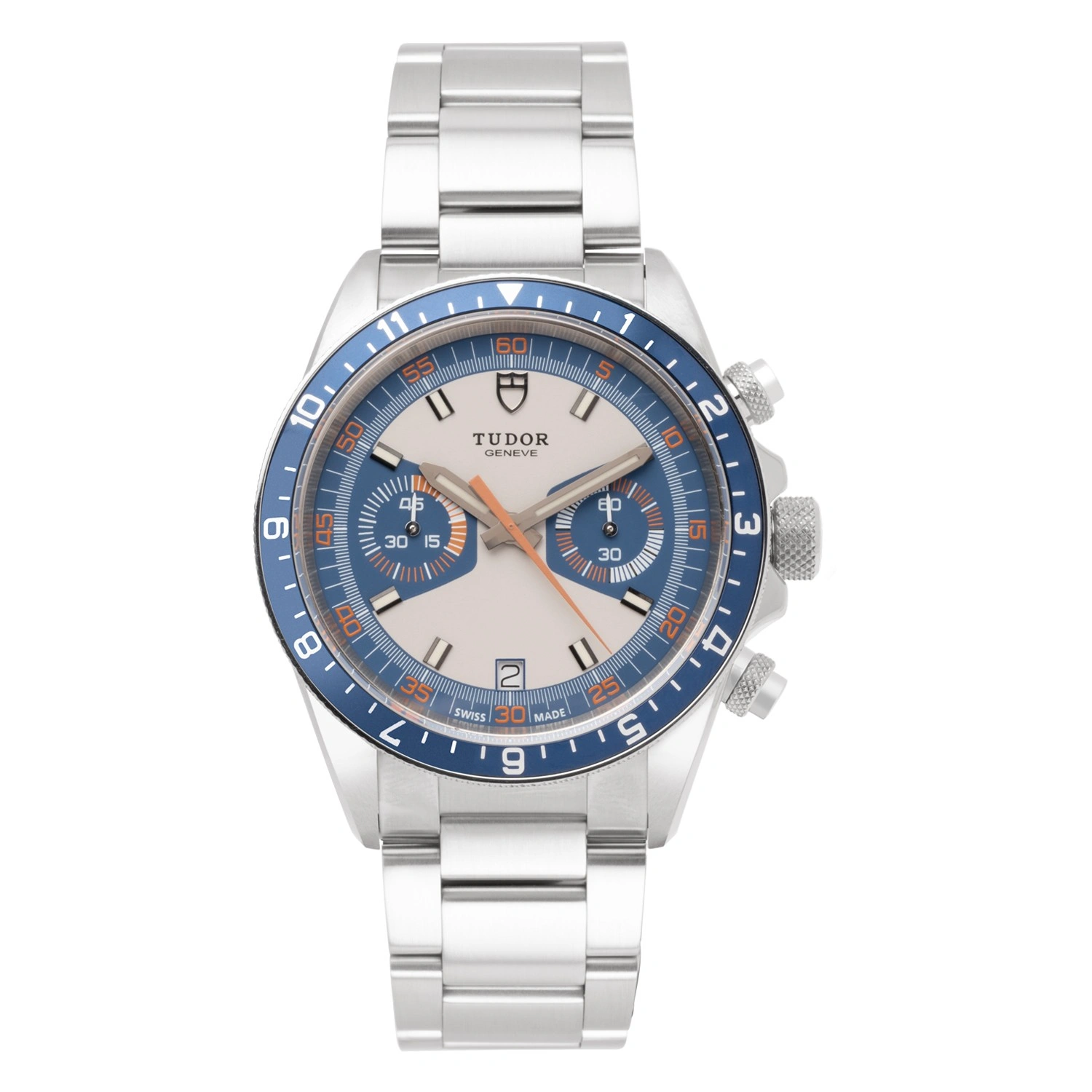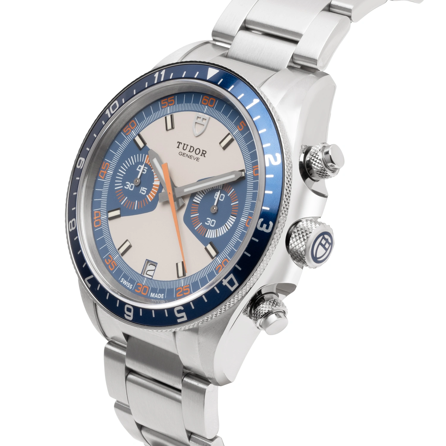 The Tudor Heritage Chrono Blue (ref. 70330B) is a striking timepiece inspired by the iconic 1970s Monte Carlo model. It features a 42mm stainless steel case, a vibrant blue and orange color scheme, a bi-directional rotating bezel with a blue anodized aluminum insert, and a reliable automatic movement. Its sporty yet vintage appeal is enhanced by chronograph functionality and 150m water resistance, making it a versatile choice for everyday wear or diving adventures.