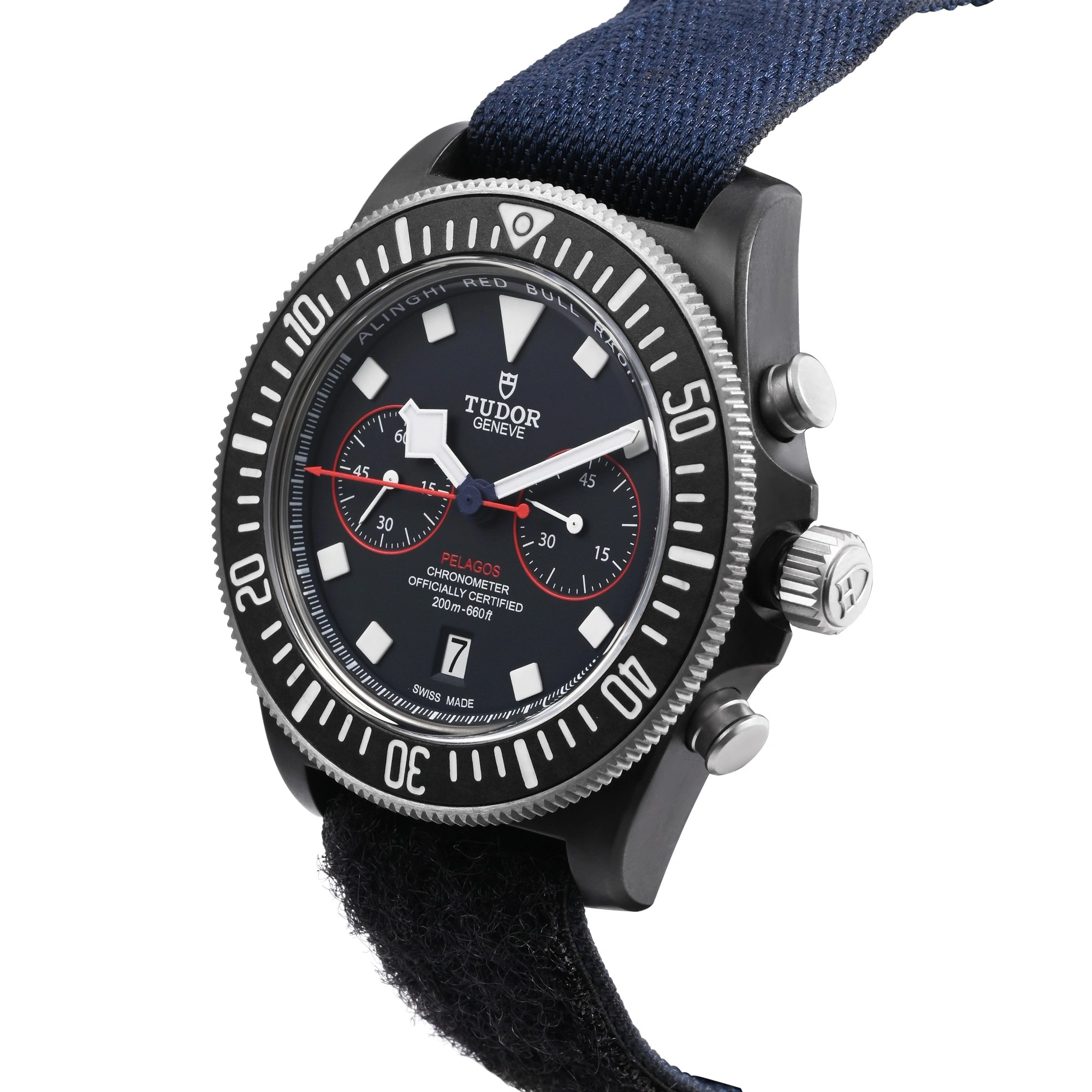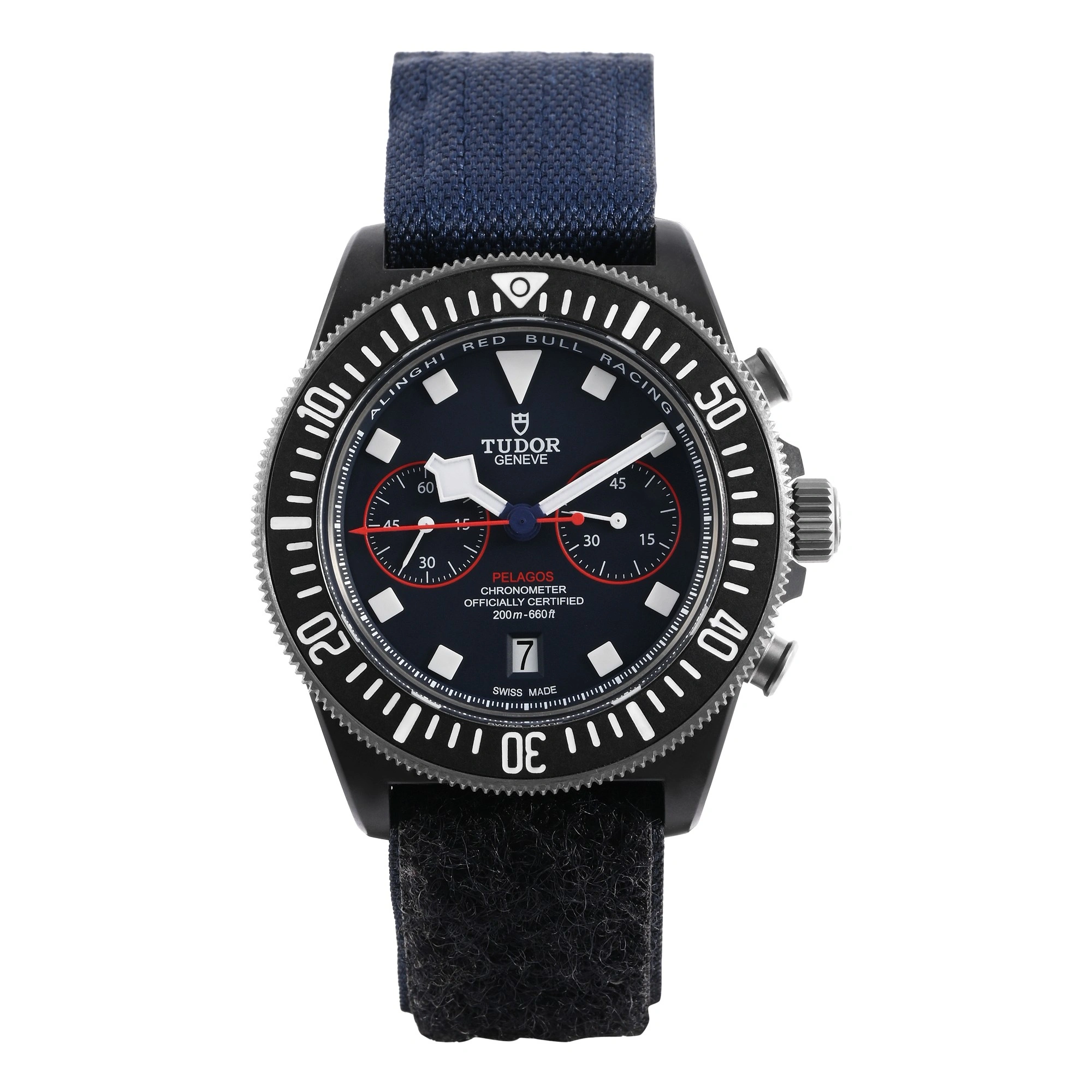 The Tudor Pelagos FXD Chrono M25807KN-0001 is a professional-grade chronograph built for precision and endurance. Crafted in lightweight titanium with a 43mm case, it features a matte black dial, red accents, and fixed strap bars for ultimate durability. Powered by the Calibre MT5813, it offers chronometer-certified performance, 70-hour power reserve, and 200m water resistance. Designed in collaboration with the Alinghi Red Bull Racing team, it embodies strength, speed, and innovation.